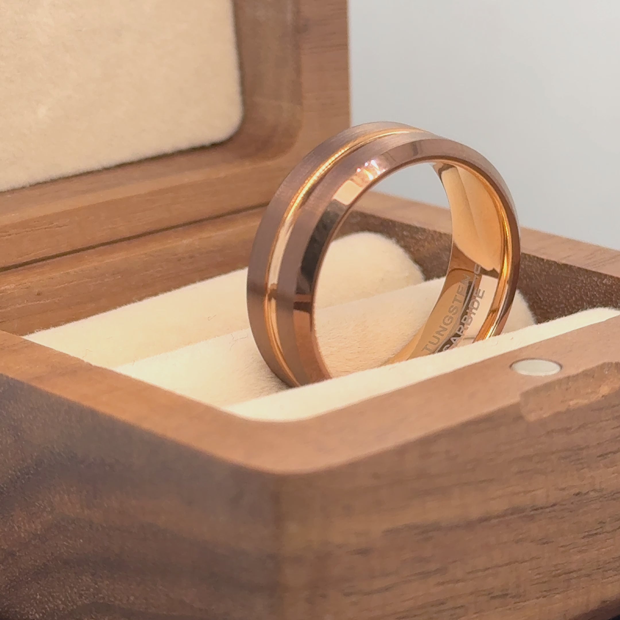 Experience the perfect blend of elegance and style with our Beveled Edge Brushed Brown IP Plated Tungsten Ring featuring a Rose Gold IP Plated Grooved Center. This meticulously crafted ring boasts a brushed brown IP plated exterior that highlights the beveled edges, creating a bold and modern aesthetic. The center of the ring is adorned with a rose gold IP plated grooved design, adding a touch of warmth and sophistication. Crafted from tungsten carbide, renowned for its durability and scratch-resistance, this ring symbolizes strength and timeless elegance. Whether chosen as a wedding band or as a fashion statement, this ring promises to captivate with its unique design and impeccable craftsmanship.