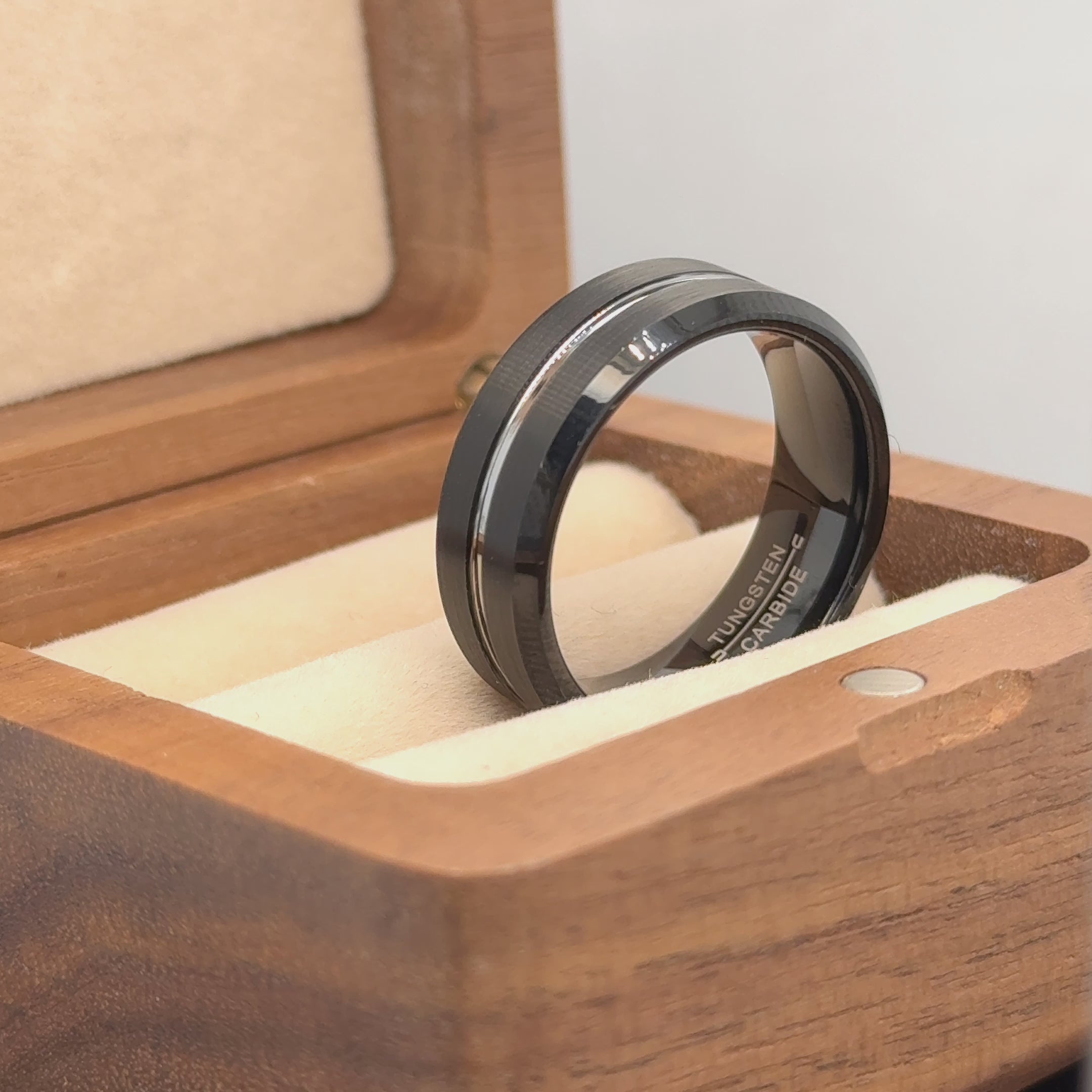Black IP Brushed with Steel Color Grooved Center Beveled Edge Tungsten Ring