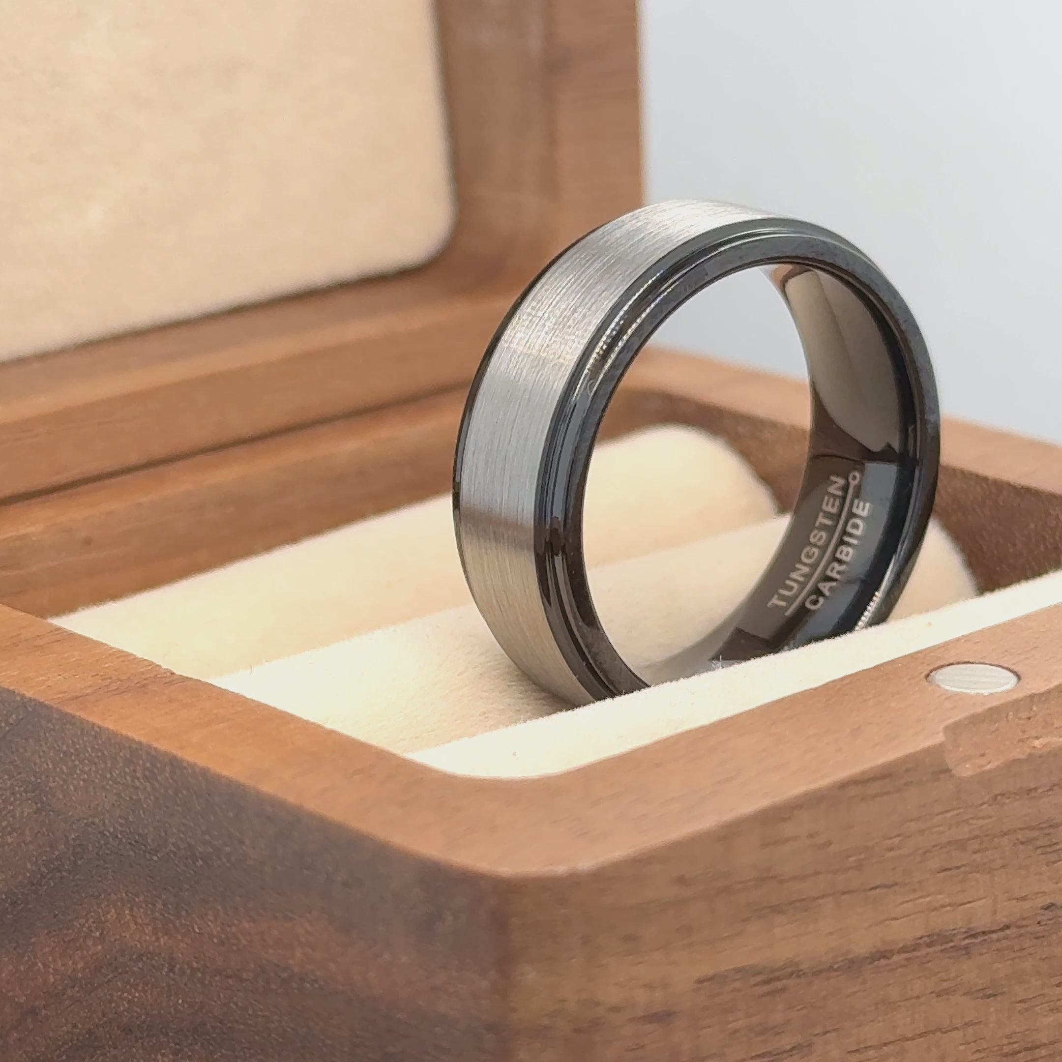 Black IP & Gun Metal Brushed Center Stepped Edge Tungsten Ring