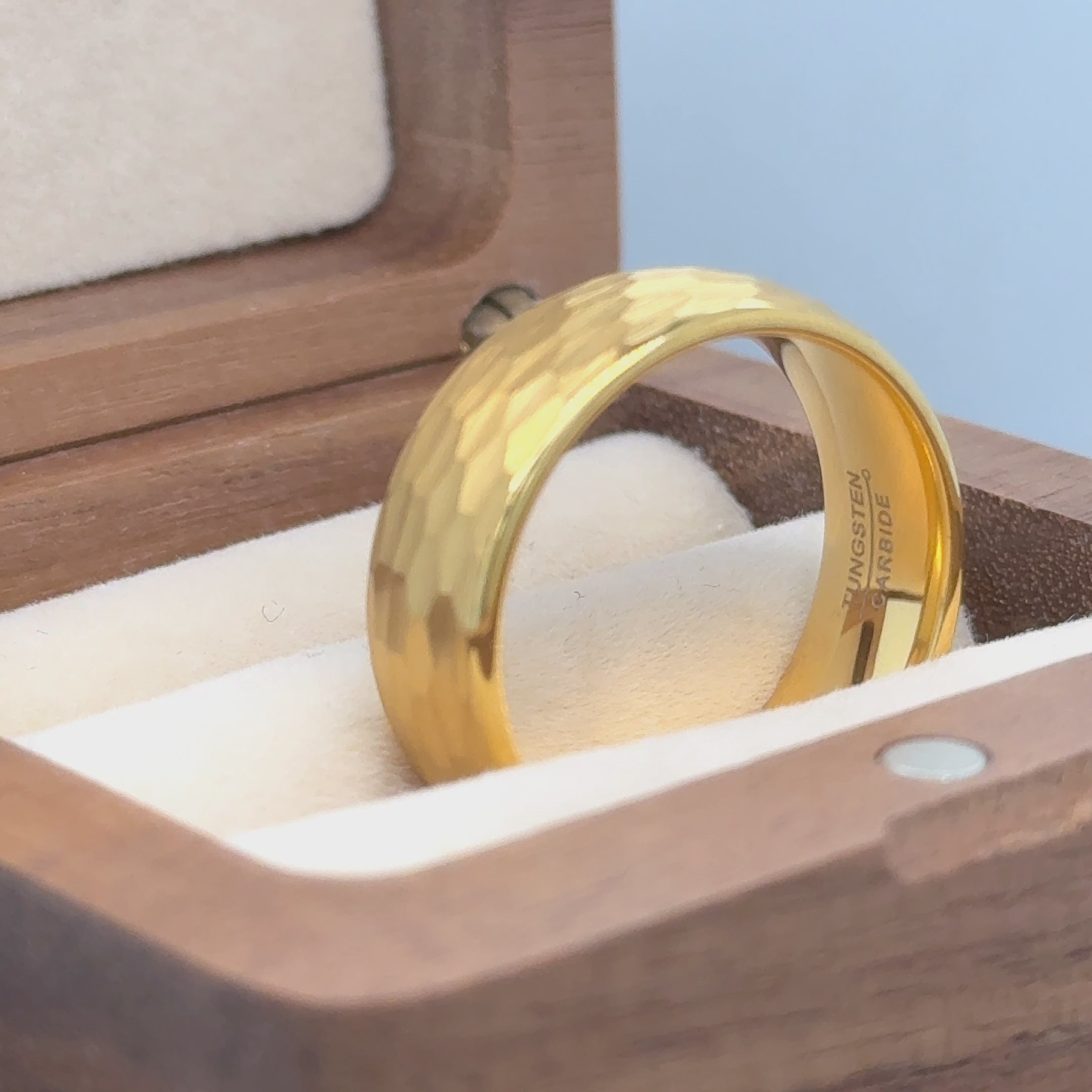 8mm Black IP Plated Brushed Chiseled Center/Yellow Gold IP Hammered Finish Tungsten Ring