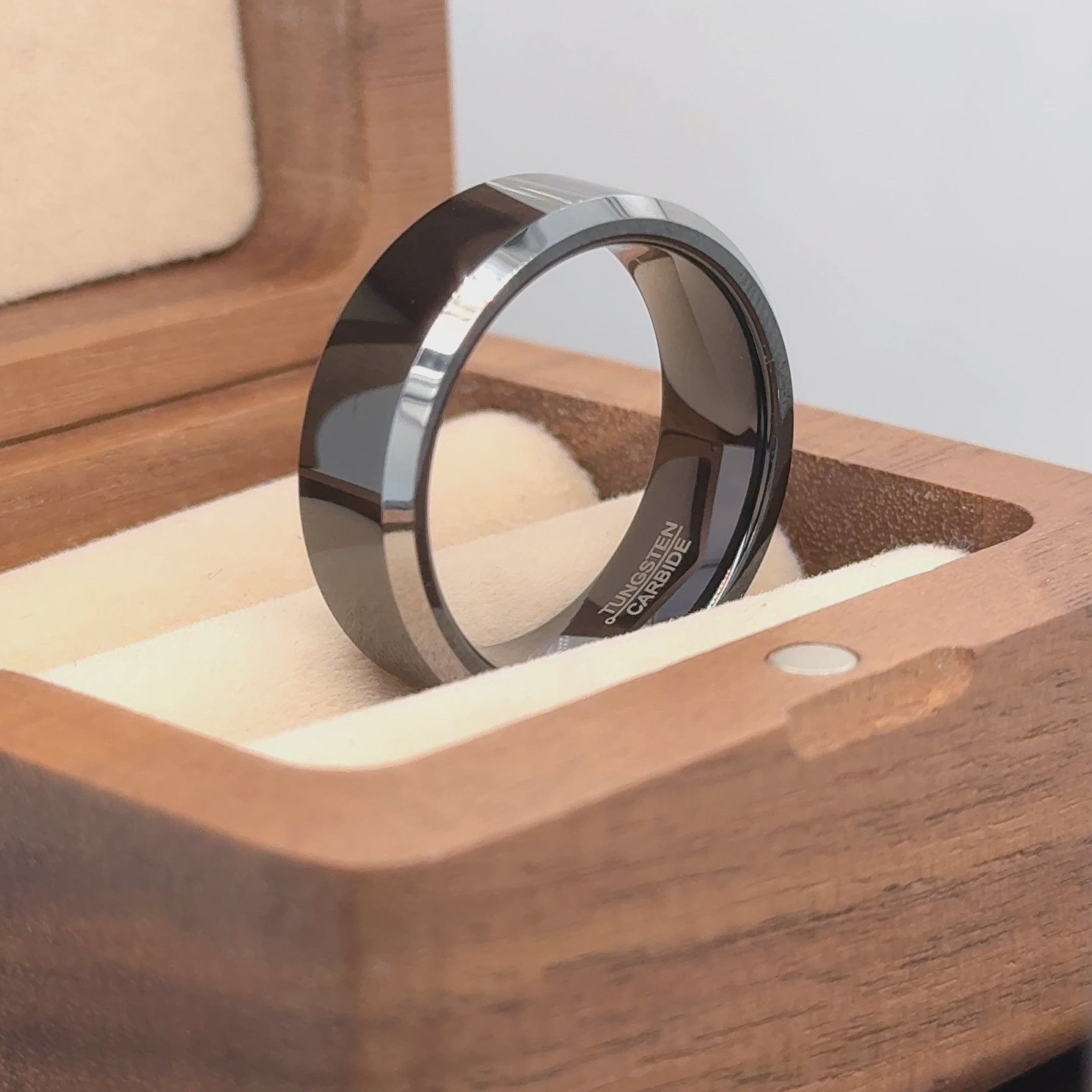Black IP Plated Center High Polished Steel Color Beveled Edge Tungsten Ring