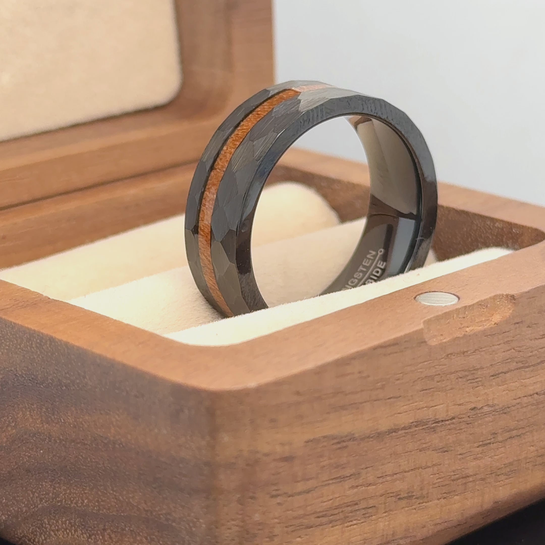 Black IP Plated Hammered Tungsten Ring with Hawaiian Koa Wood Inlay