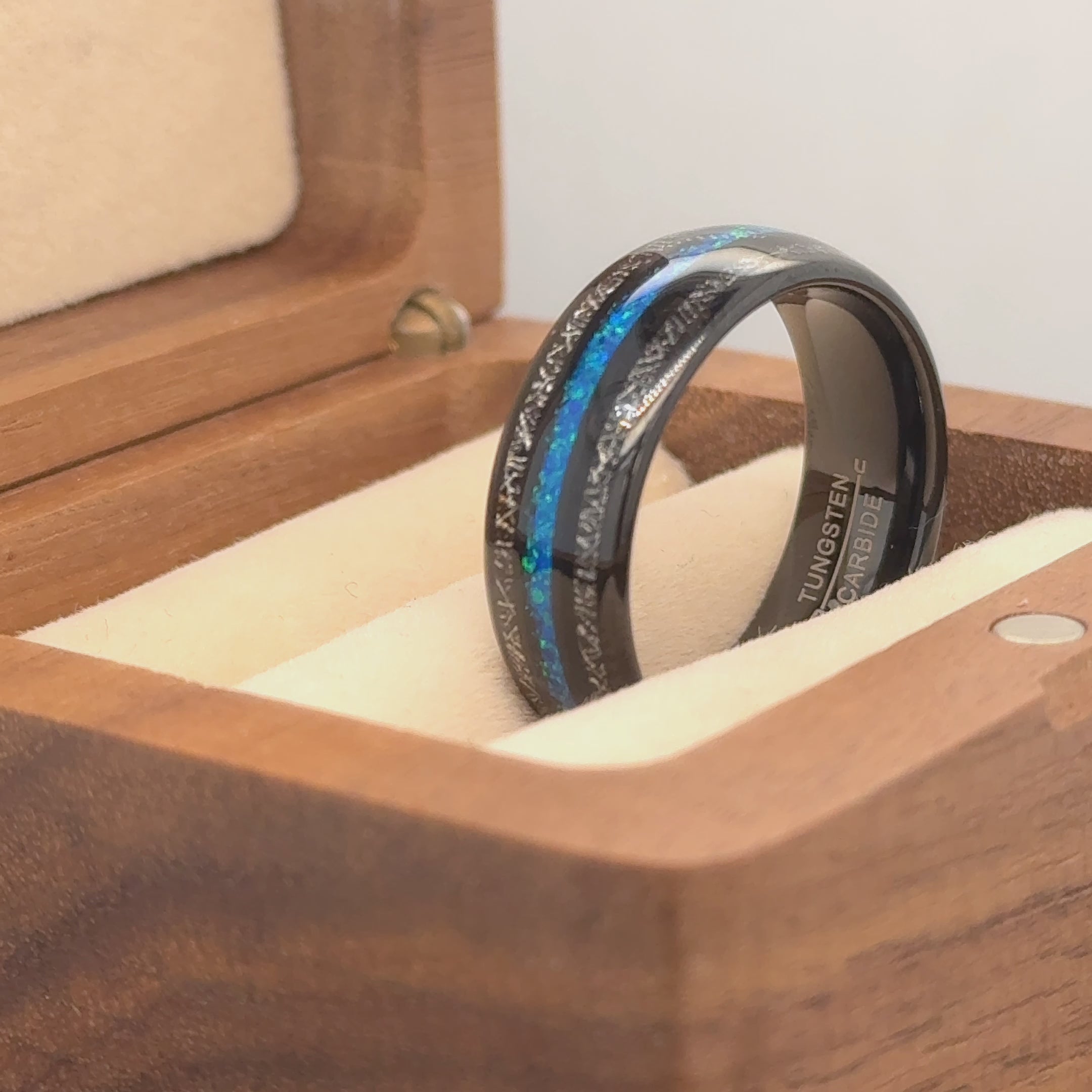 8mm Black IP Plated Koa & Crushed White Turquoise Inlay / Titanium Scraps & Opal Inlay Tungsten Ring