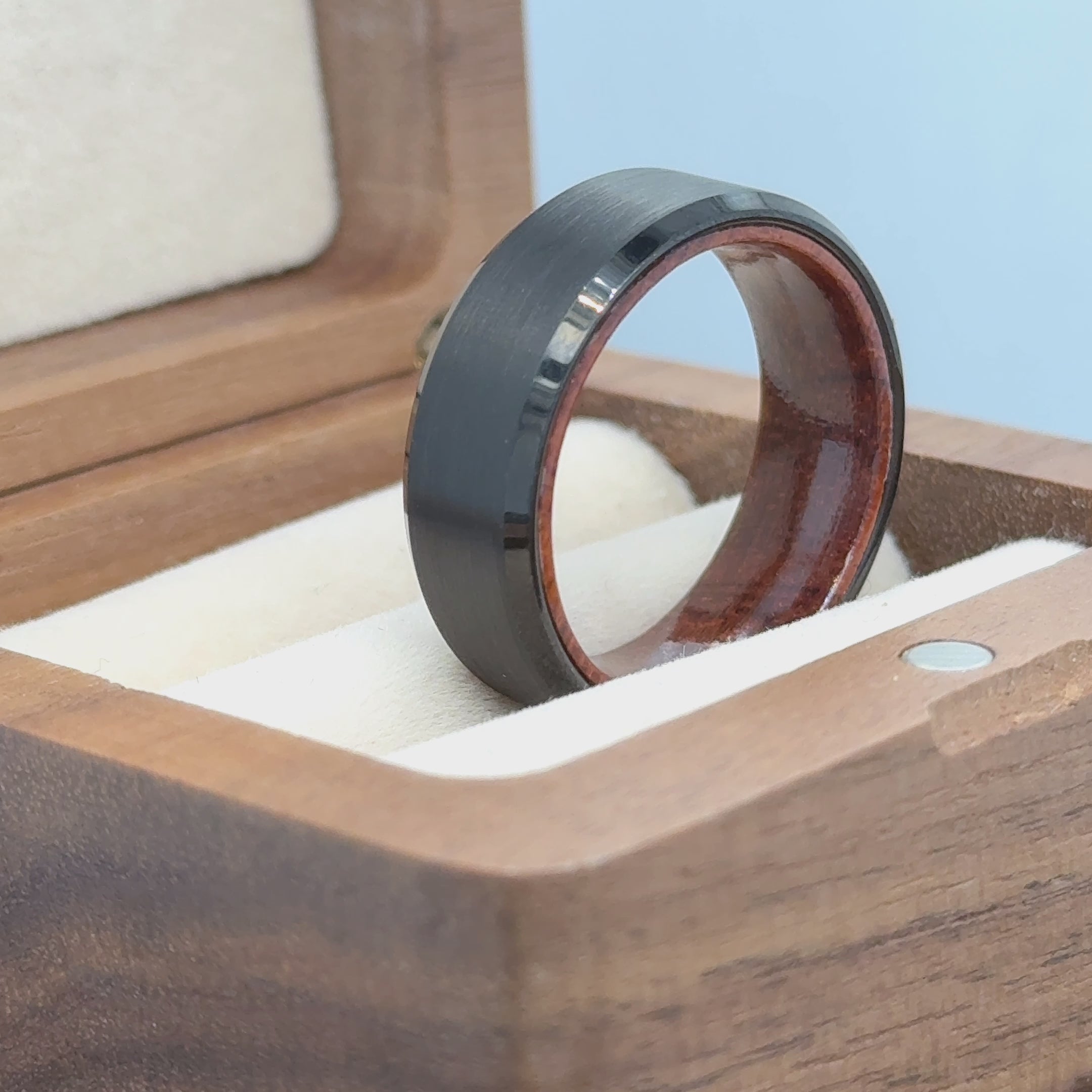 8mm Black IP Plated Titanium/Tungsten Ring Brushed Center Beveled Edge Titanium Ring Wood Sleeve Tungsten Ring