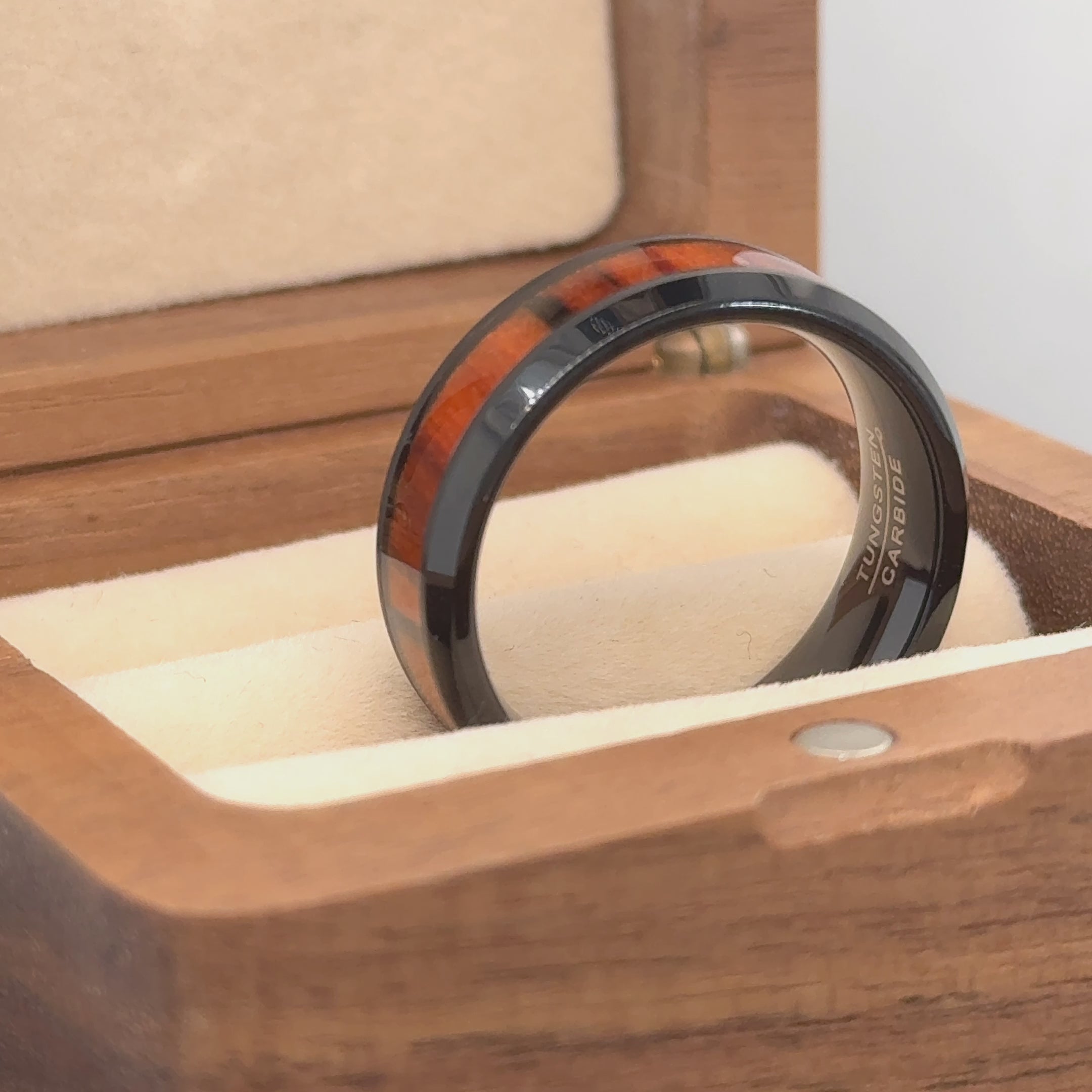 8mm Black IP Plated Tungsten Ring with Synthetic Orange Opal/Dark Mahogany Wood Inlay