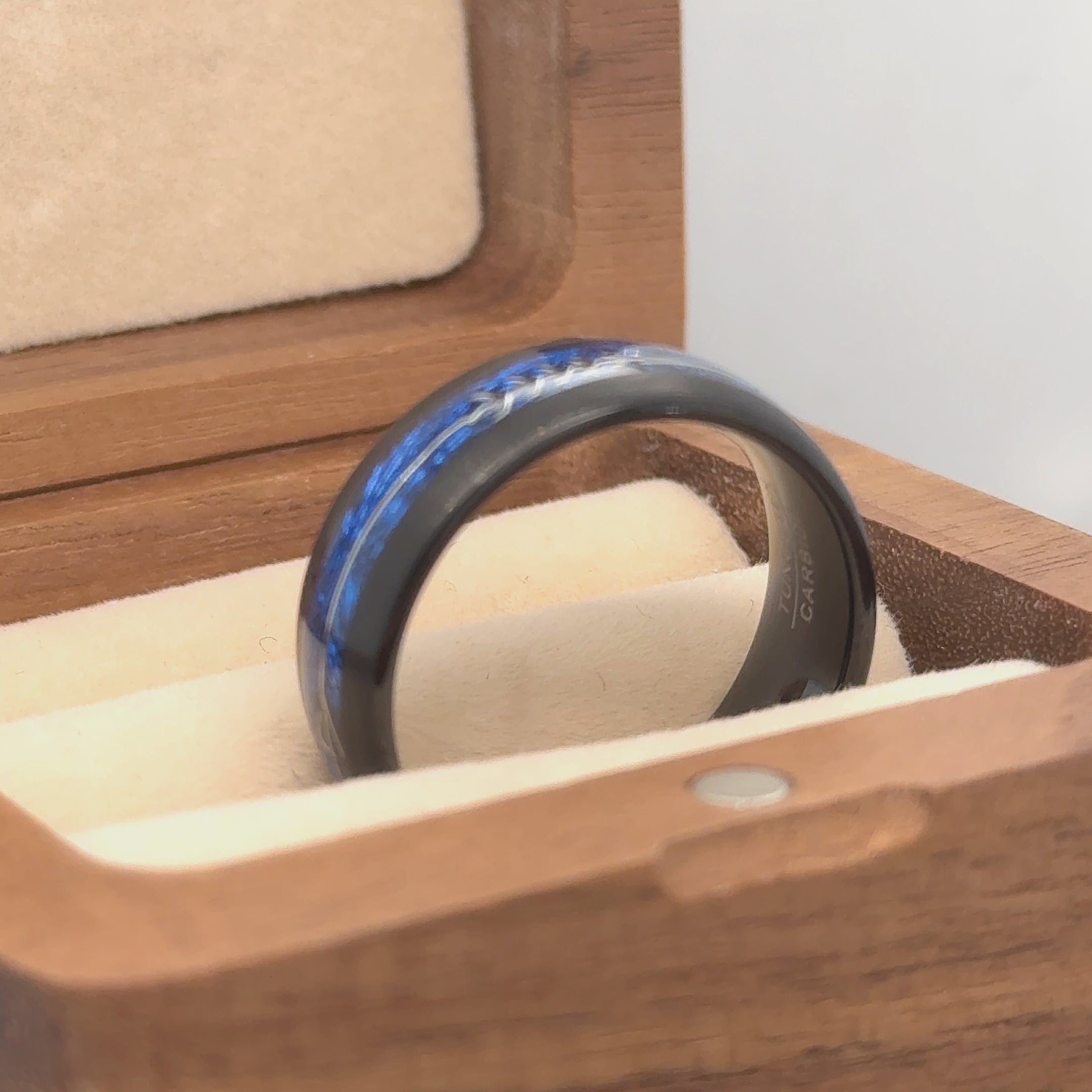Discover elegance with our Black IP Plated with Blue Silk Thread Inlay Tungsten Ring, where craftsmanship meets contemporary design. Crafted from tungsten carbide, known for its strength and scratch resistance, this ring embodies durability and style. The black IP plating offers a sleek and modern finish, complemented by the unique inlay design featuring blue silk thread. This intricate detail adds a touch of sophistication and uniqueness to the ring, making it a standout piece for any occasion. Whether as a wedding band or a fashion statement, this ring is a symbol of refined taste and enduring beauty.