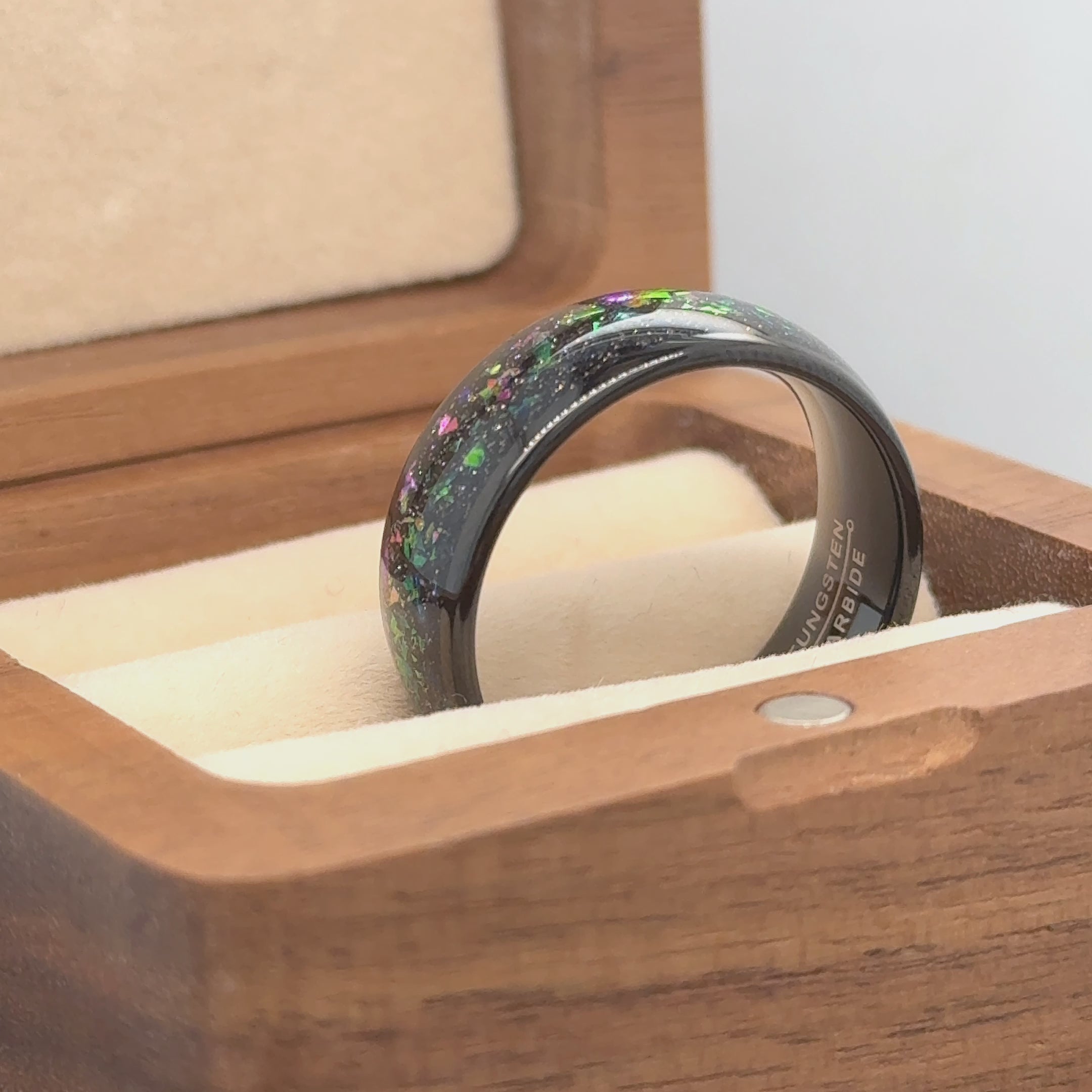 8mm Black IP / Rose Gold IP Domed with Synthetic Opal & Abalone Fragments Inlay Tungsten Ring