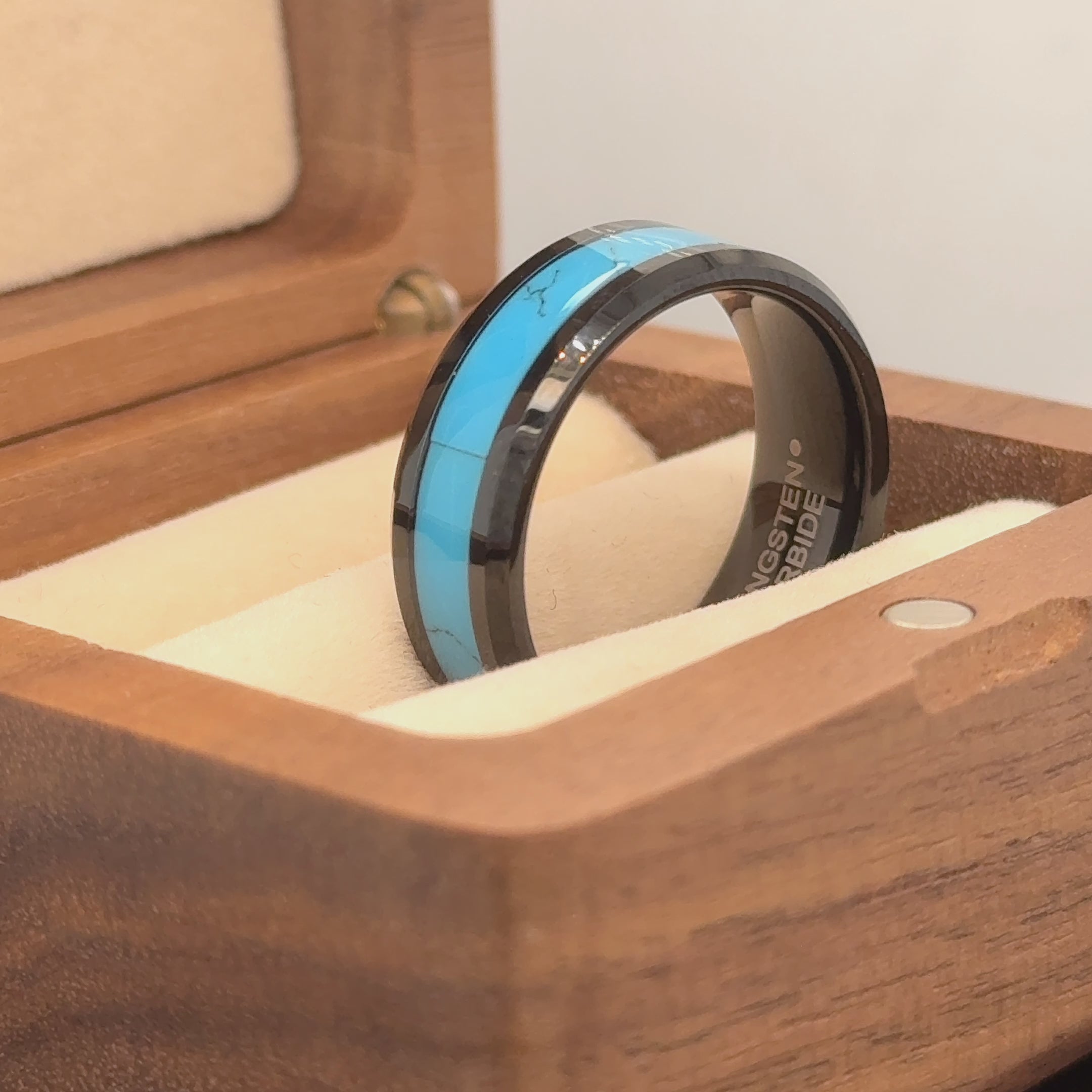✅ Striking black IP plated tungsten ring with synthetic blue turquoise inlay.
