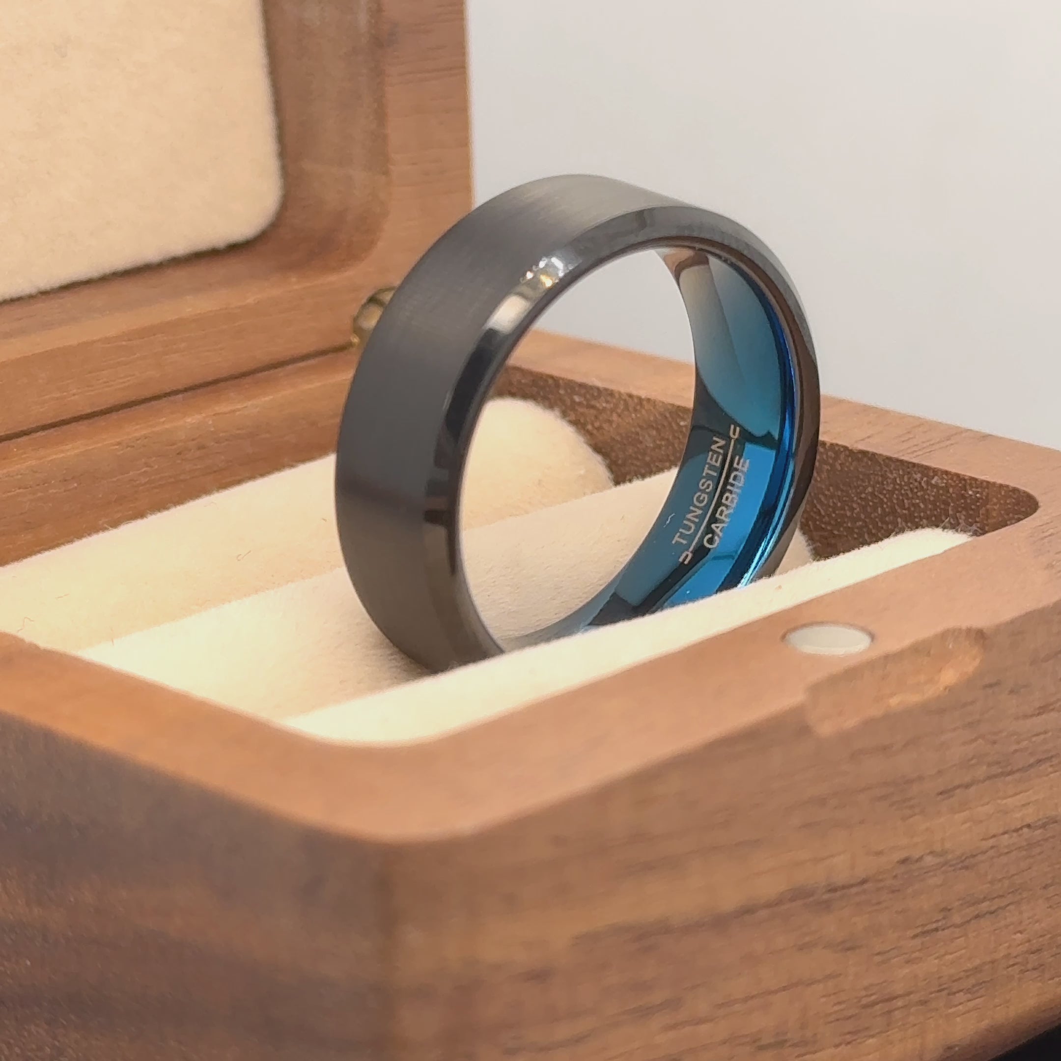Black Outside Blue Inside IP Plated Tungsten Ring with Brushed Center and Beveled Edge
