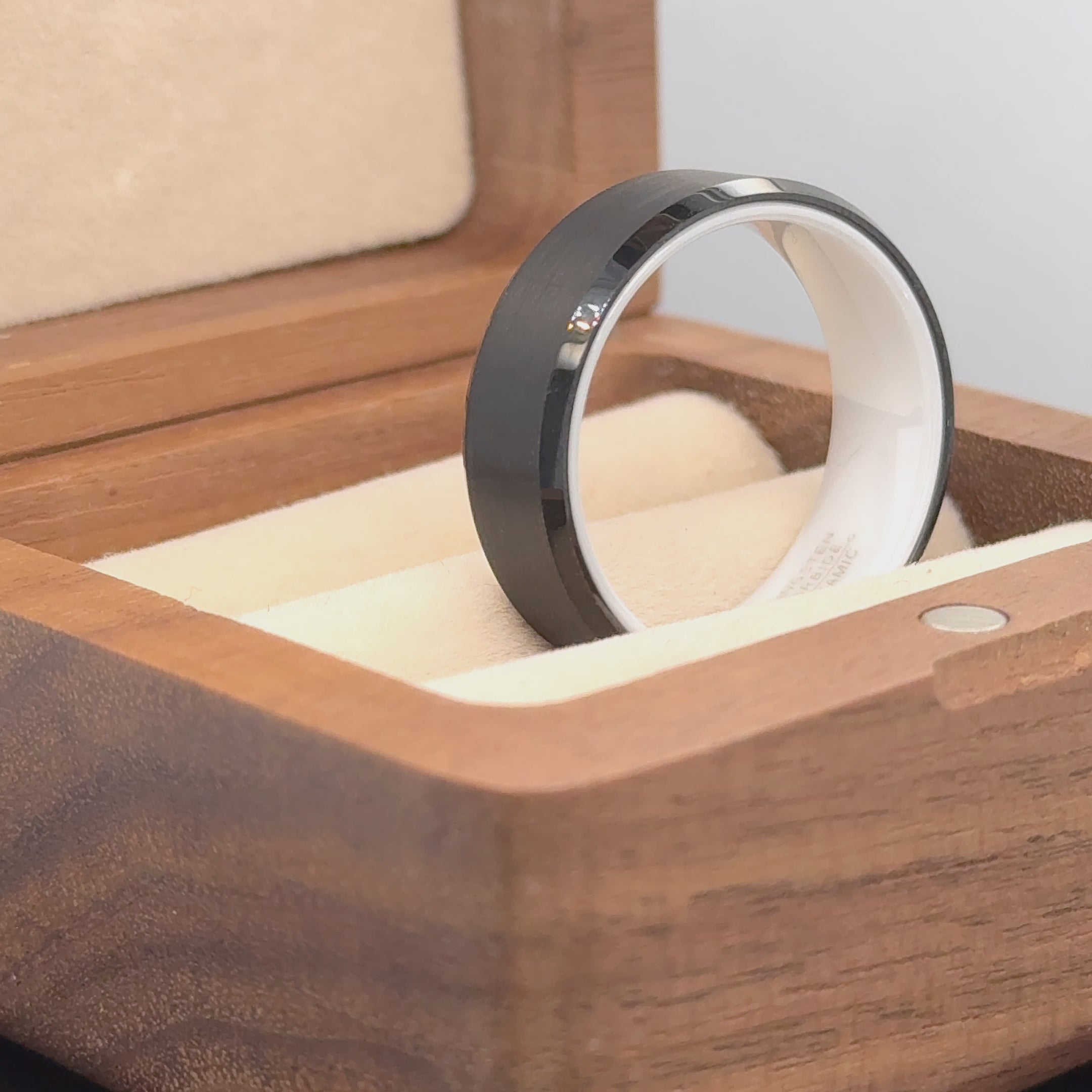 Experience sophistication and durability with our Black Plated Beveled Edge with ORANGE Anodized Aluminum Sleeve/White Ceramic Sleeve Tungsten Ring. Crafted from tungsten carbide, renowned for its strength and scratch resistance, this ring combines a sleek black plated finish with stylish beveled edges. The vibrant ORANGE anodized aluminum sleeve/White Ceramic Sleeve adds a striking contrast and modern flair, making this ring a standout piece for any occasion. Whether chosen as a symbol of commitment or as a bold fashion statement, this ring merges robustness with unique aesthetics. Our Black Plated Beveled Edge with ORANGE Anodized Aluminum Sleeve Tungsten Ring is designed to withstand daily wear while maintaining its polished appearance