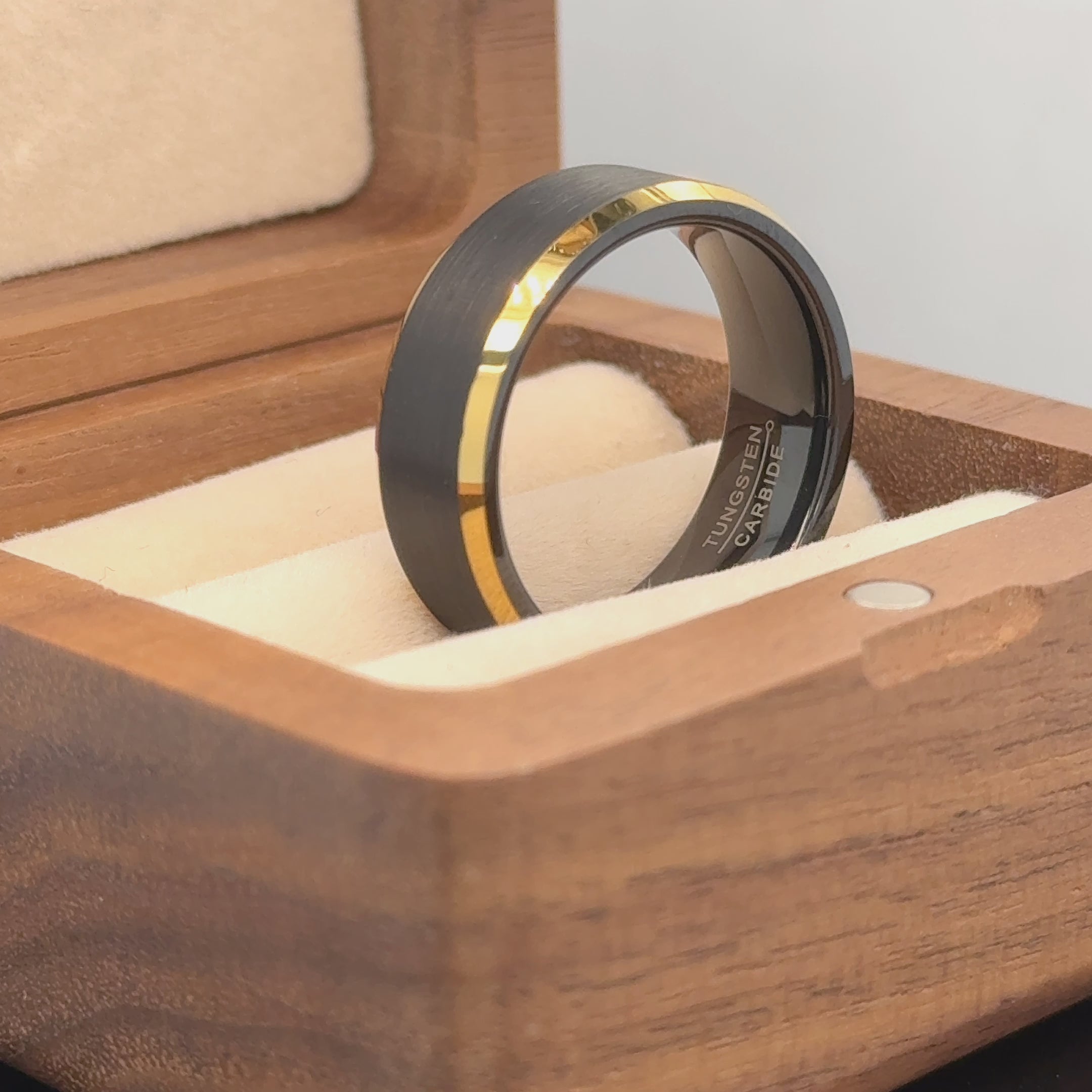 Black & Yellow Gold IP Brushed Center Beveled Edge Tungsten Ring