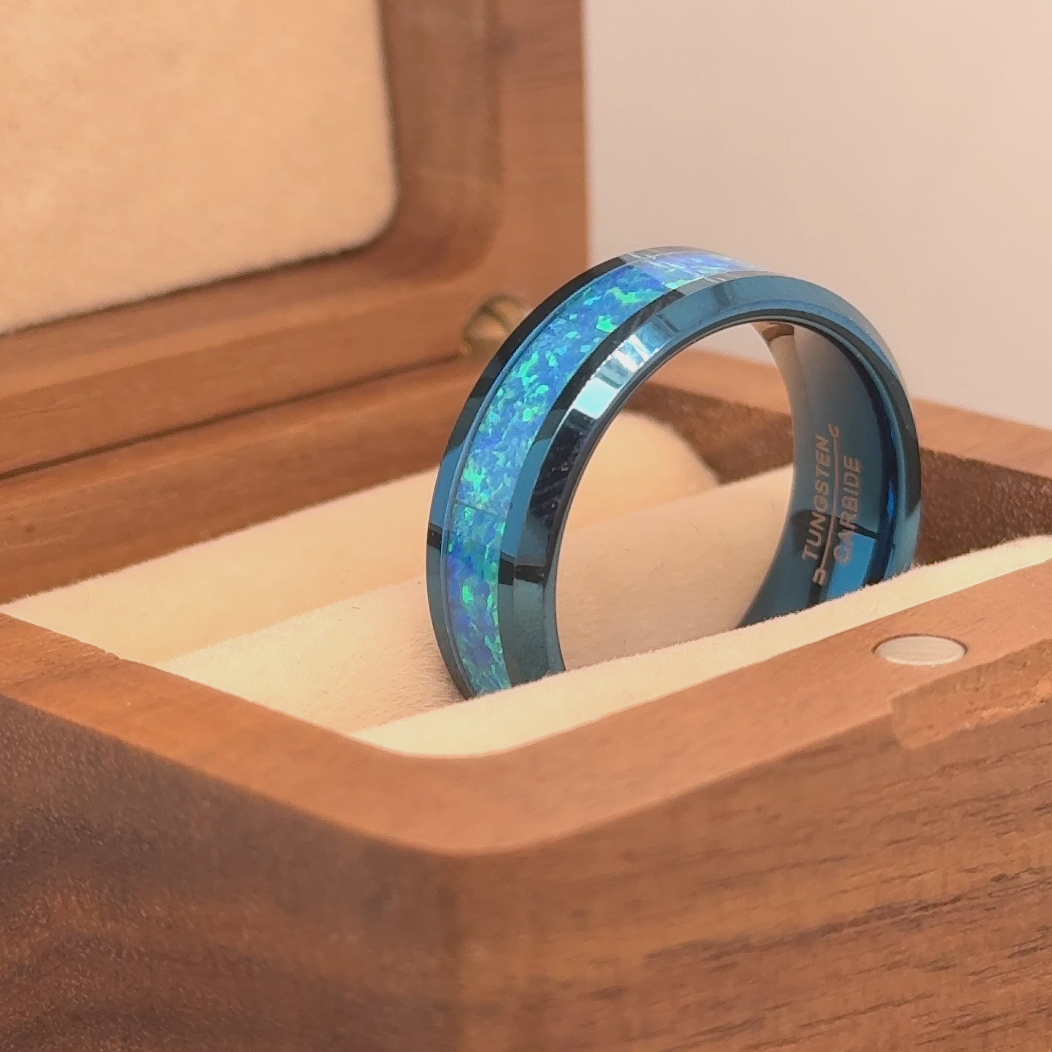 8mm Blue/Silver IP Plated with Synthetic Blue Green Opal Inlay Tungsten Ring