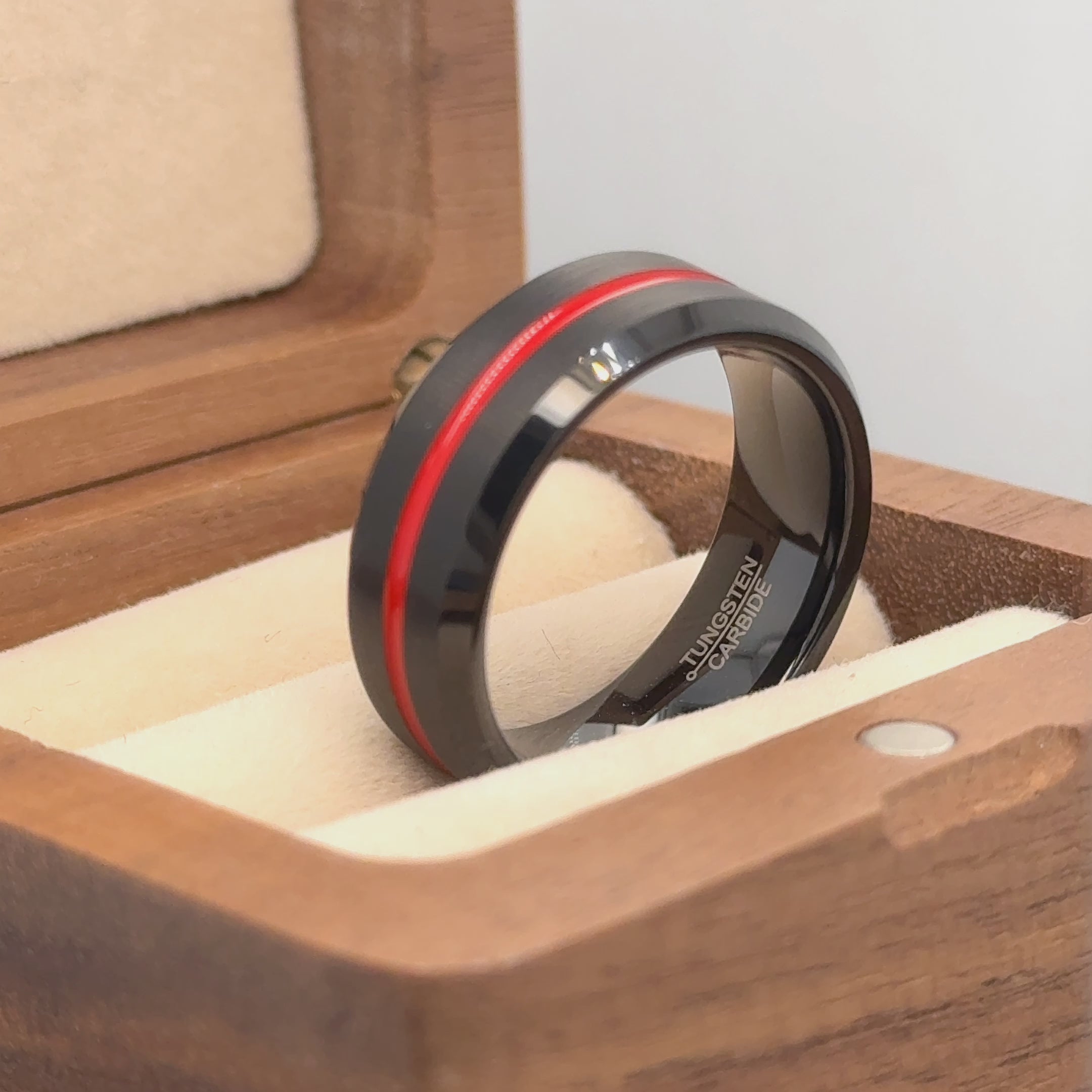 Brushed Tungsten Ring with Red IP Plated Grooved Center