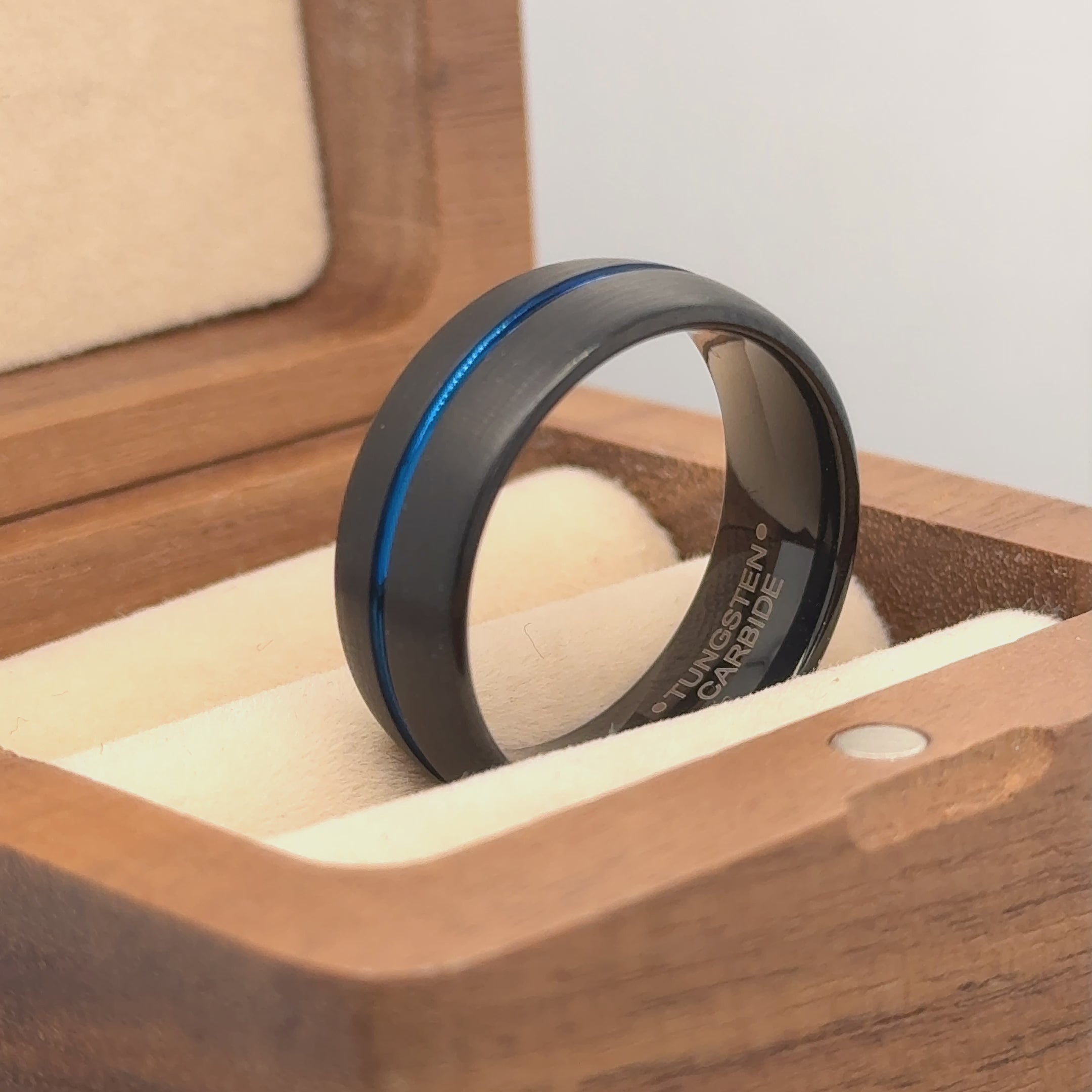 8mm Dome Black IP Tungsten Ring with Blue IP Center Groove