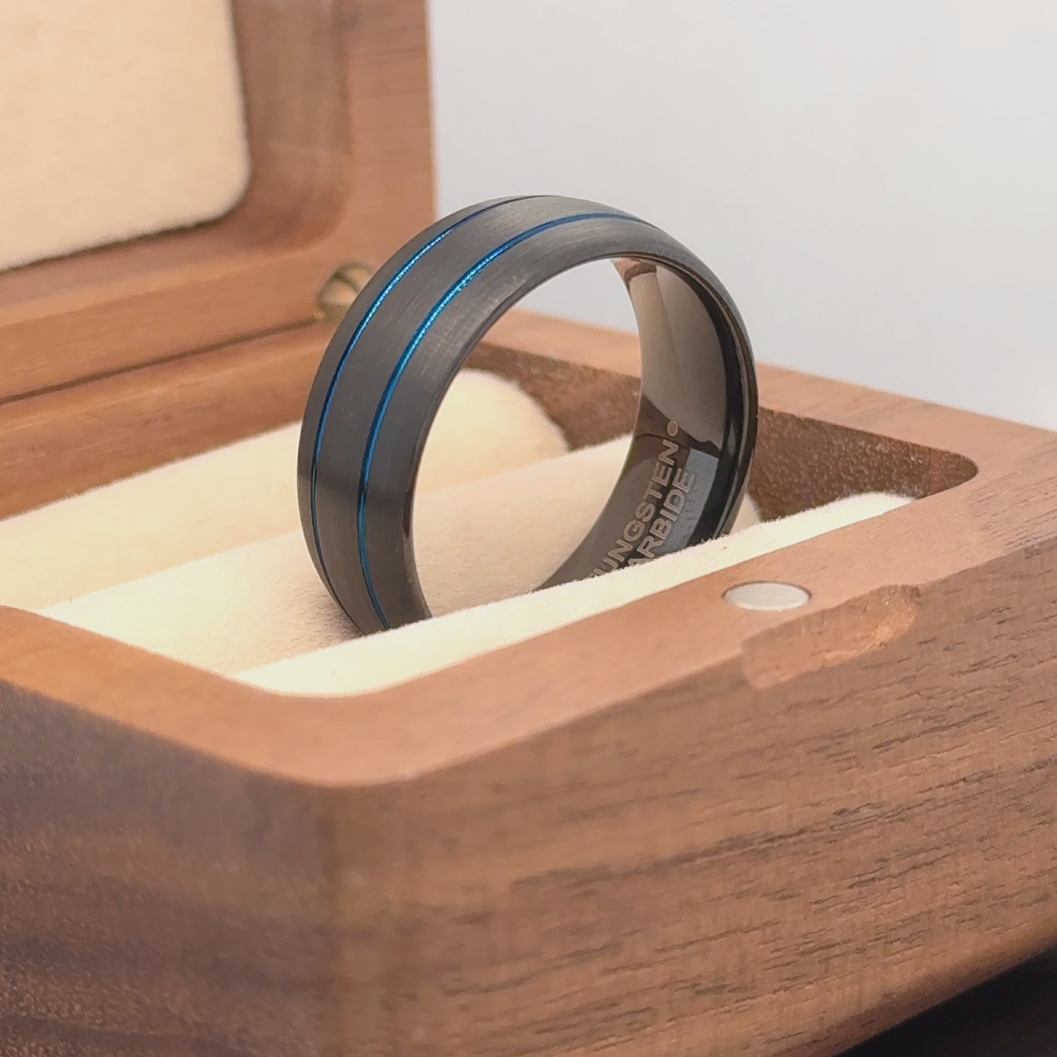 Dome Black IP Tungsten Ring with Two Blue IP Grooves