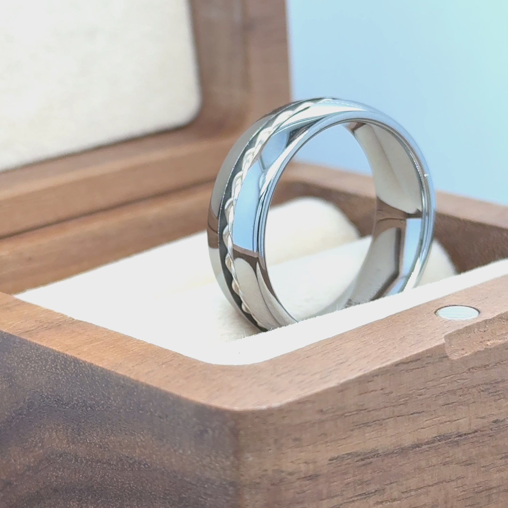 Discover the elegance and durability of the Grooved with Braided Sterling Silver Insert Tungsten Ring, where intricate design meets strength. The ring features a captivating braided sterling silver insert set against a backdrop of grooved detailing, creating a modern aesthetic that resonates with sophistication. Crafted from tungsten carbide, renowned for its resilience and scratch resistance, this ring symbolizes enduring love and commitment. Whether worn as a wedding band or a fashion statement, it embodies timeless elegance and exceptional craftsmanship. Embrace the union of style and strength with this remarkable piece that celebrates your unique journey.