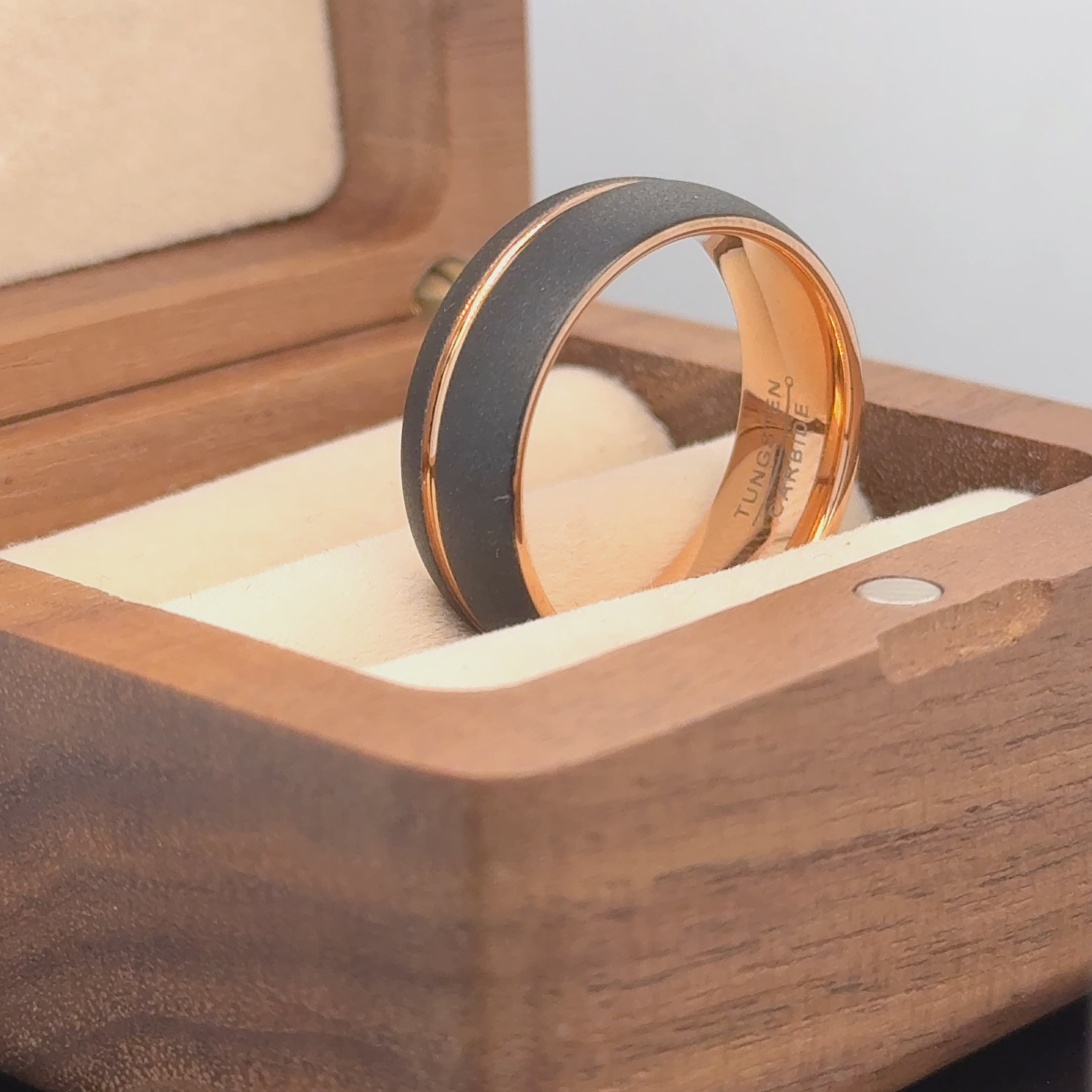 8mm Domed Rose Gold & Black IP Plated Sandblasted Finish/Rose & Black IP Grooved Pipe-Cut Tungsten Ring