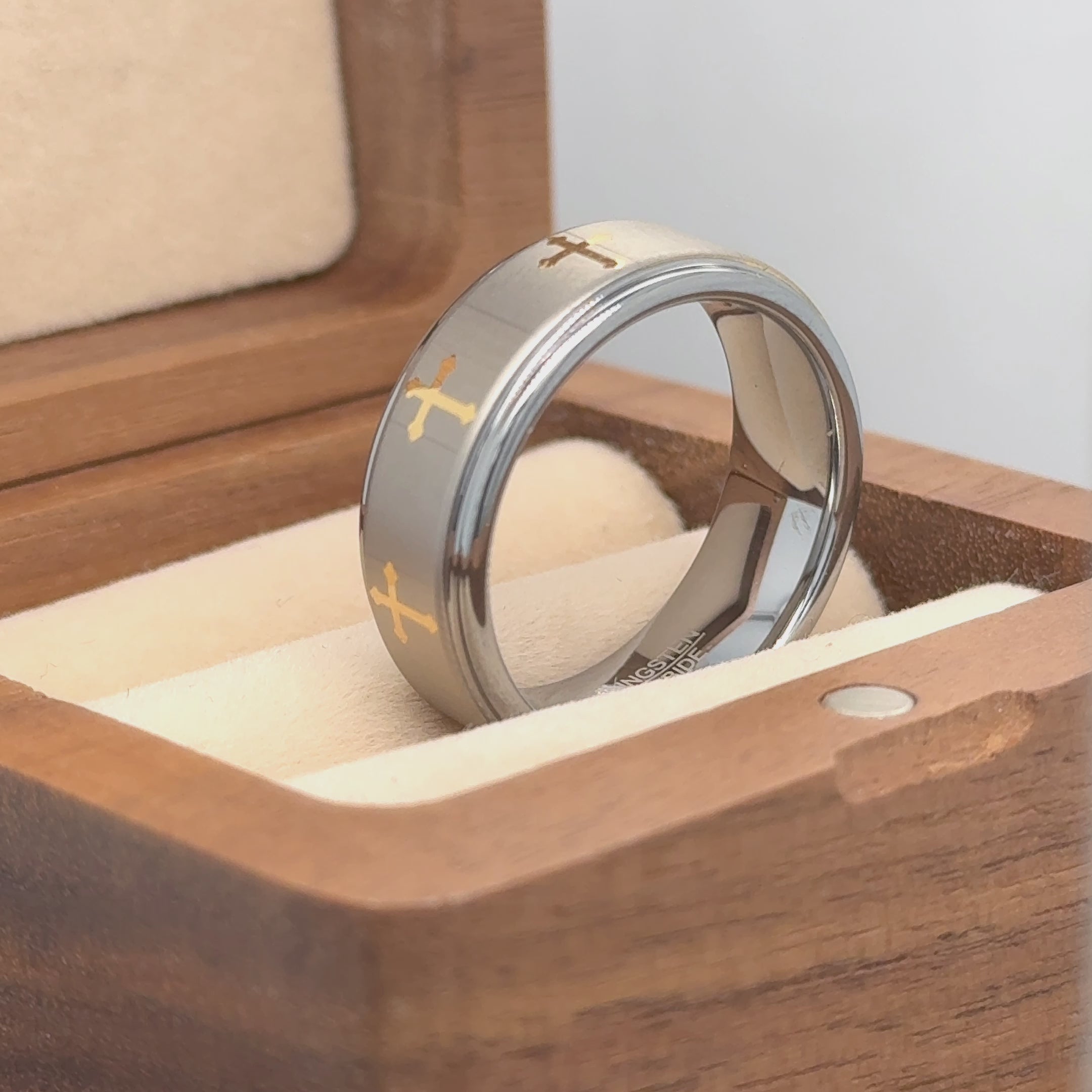 Flat Brushed Center Laser Engraved Crosses Tungsten Ring