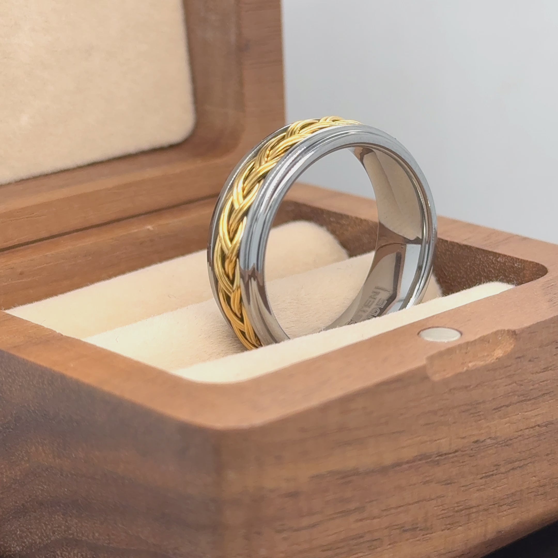 8mm Grooved Hammered Finish & Rose Gold IP Plated Inside Tungsten Ring Step Edge with Yellow Gold IP Plated Double Braid Inlay Tungsten Ring