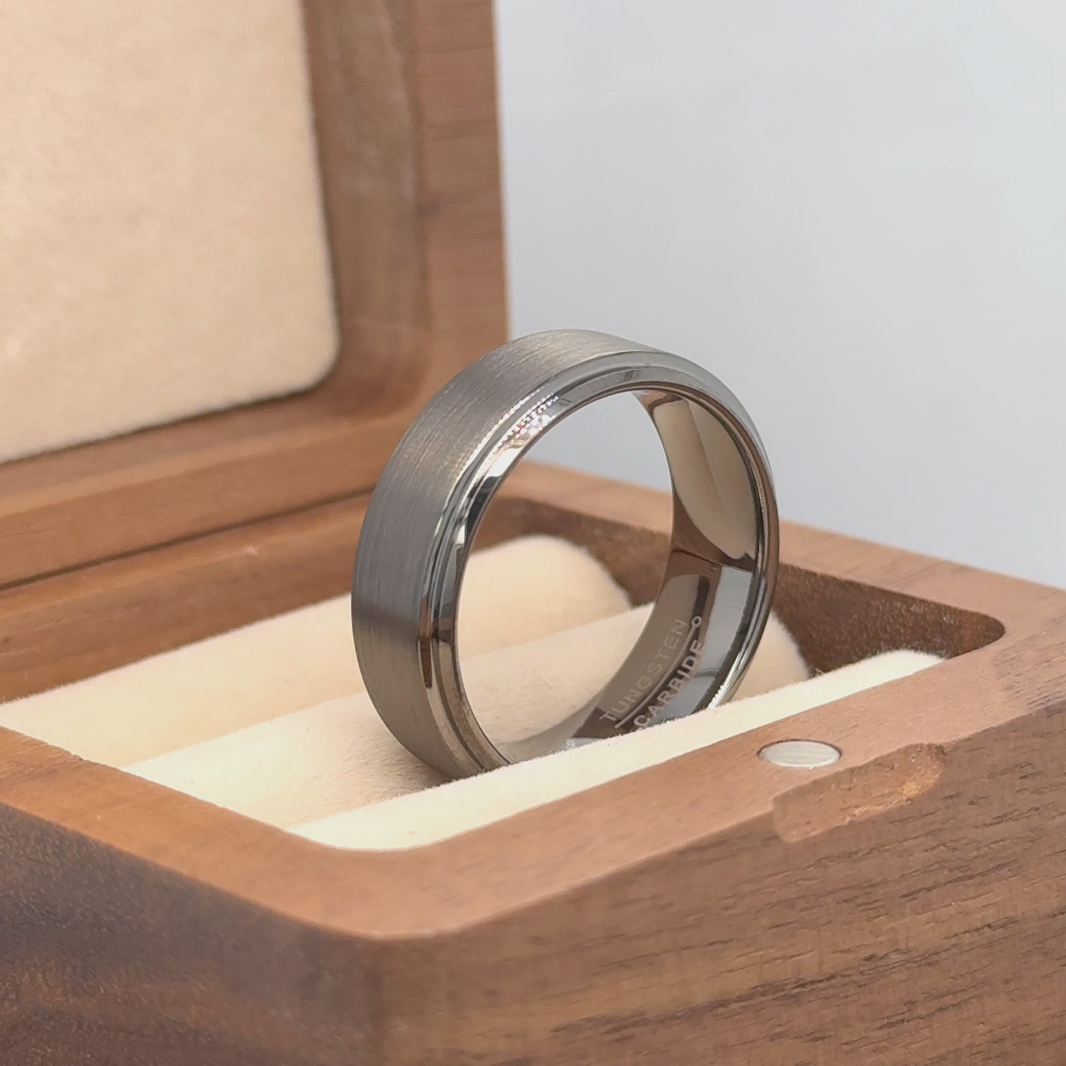 Discover sleek sophistication with our Gun Metal IP Plated Brushed Center High Polish Stepped Edge 8mm Tungsten Ring. Crafted from tungsten carbide, renowned for its strength and scratch resistance, this ring features a modern design that blends brushed and high polish finishes. The gun metal IP plating enhances its contemporary appeal while providing durability and a distinctive matte look. The stepped edges add a touch of elegance and uniqueness to the 8mm width, making it an ideal choice for any occasion. Whether worn as a symbol of commitment or as a stylish accessory, this ring combines durability with refined aesthetics. Our Gun Metal IP Plated Brushed Center High Polish Stepped Edge 8mm/6mm/4mm Tungsten Ring is designed to withstand daily wear while maintaining its polished appearance.
