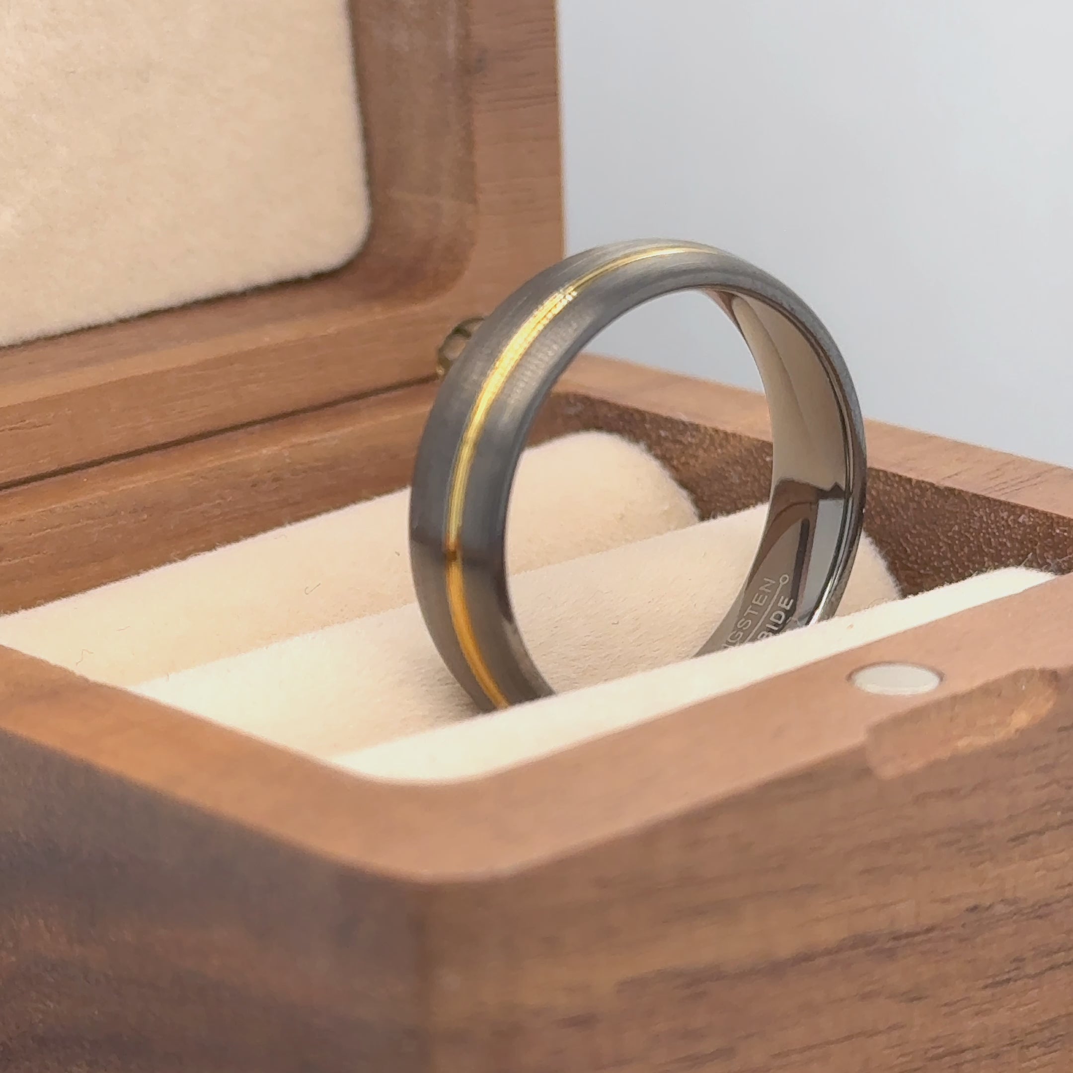 Gun Metal IP Plated Brushed Domed with Off Center Yellow IP Strip Tungsten Ring