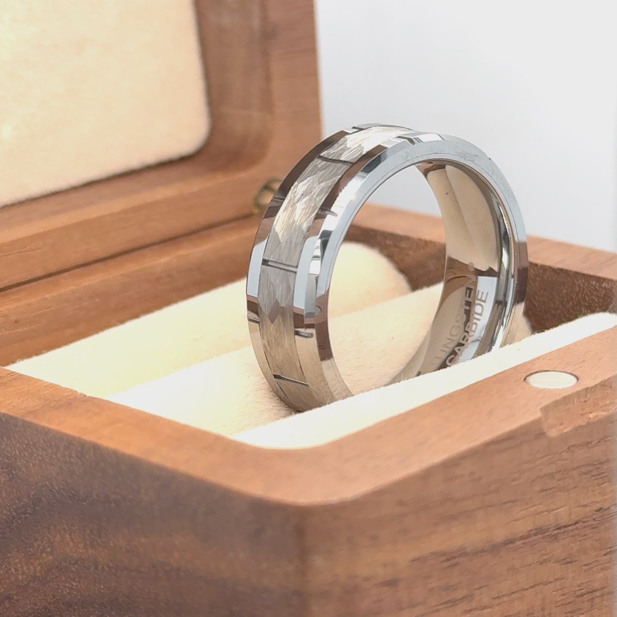 Explore contemporary elegance with our High Polished Beveled Edge with Notches & Black IP Plated Hammered Finish Tungsten Ring. This meticulously crafted ring combines the classic sophistication of high polished beveled edges with unique notches, adding a touch of modern flair. The hammered finish on the central band provides a textured contrast, making it a standout piece in any collection. Constructed from tungsten, renowned for its durability and scratch resistance, this ring is designed to withstand the rigors of daily wear while maintaining its polished appearance. The black IP plating further enhances its visual appeal, making it an ideal choice for weddings or as a statement piece. Embrace timeless style and durability with this exceptional tungsten ring.