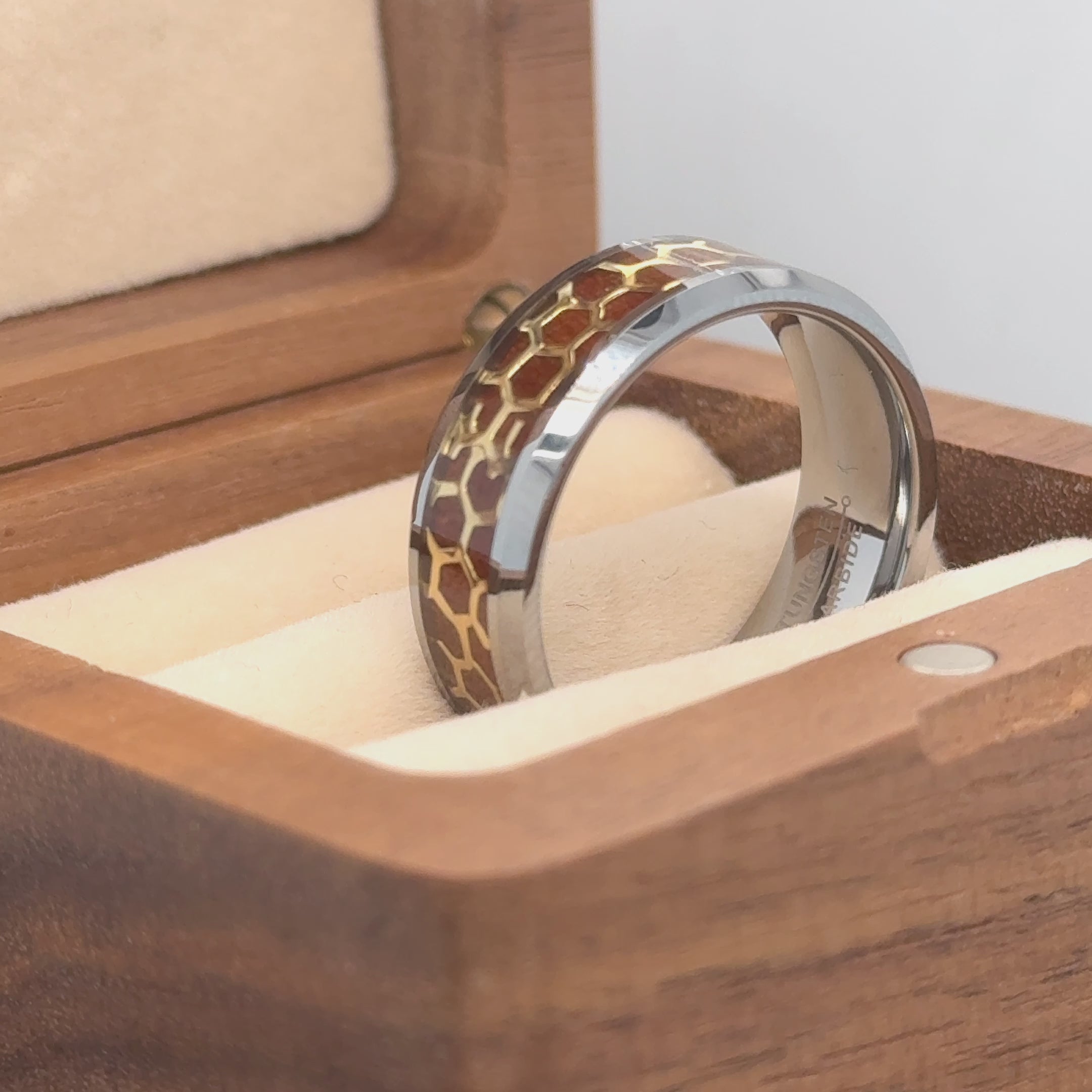 Experience the fusion of nature-inspired beauty and modern craftsmanship with our Honeycomb Cut-out over Abalone Inlay Beveled Edge Tungsten Ring. Made from tungsten, renowned for its strength and scratch-resistance, this ring showcases a captivating honeycomb cut-out design that overlays a mesmerizing abalone inlay. The beveled edges add sophistication to its unique appearance, making it a standout piece suitable for any occasion. Whether chosen to symbolize enduring commitment or as a reflection of personal style, this ring embodies innovation and elegance, perfect for the discerning gentleman.