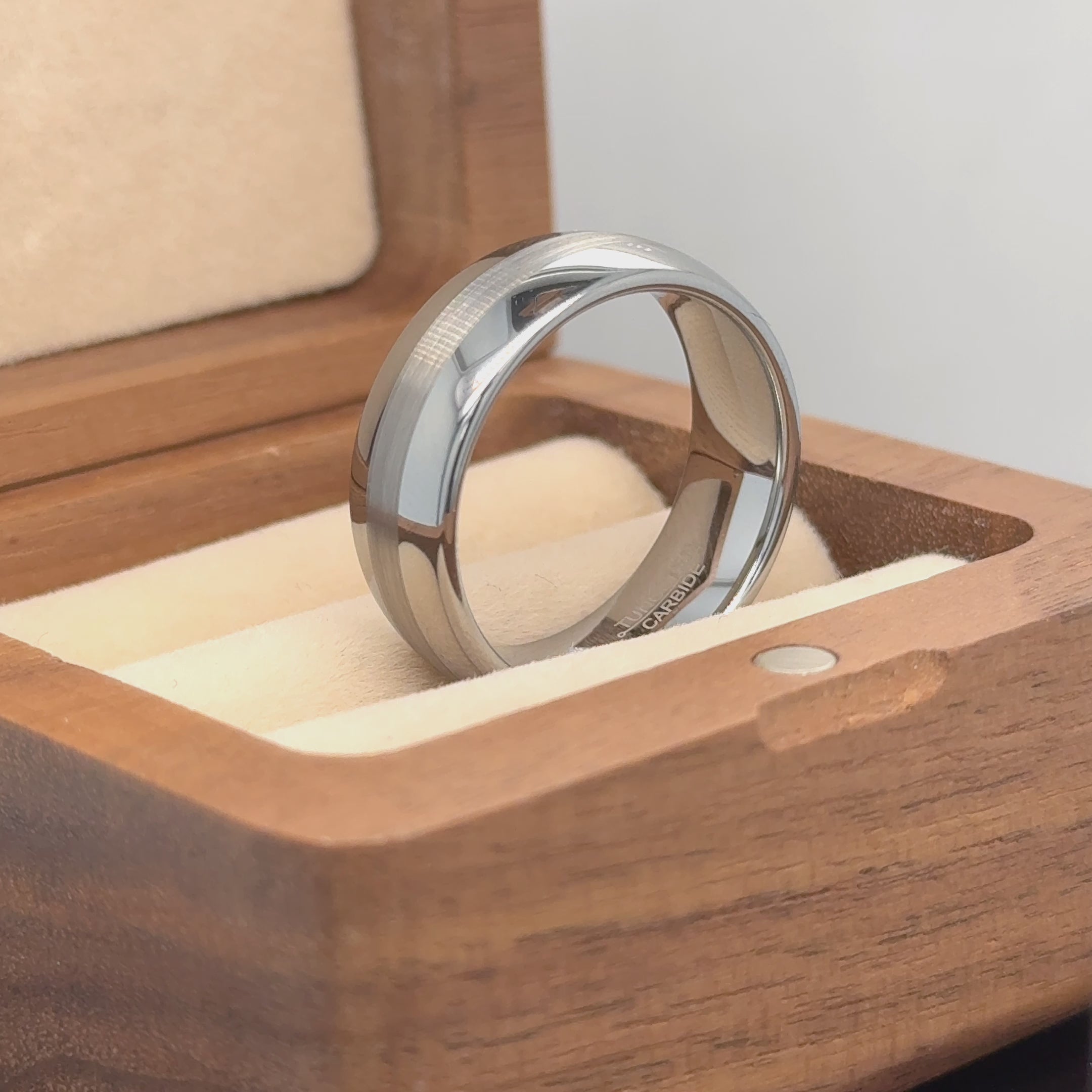✅ Tungsten ring with a polished shiny finish and brushed center.