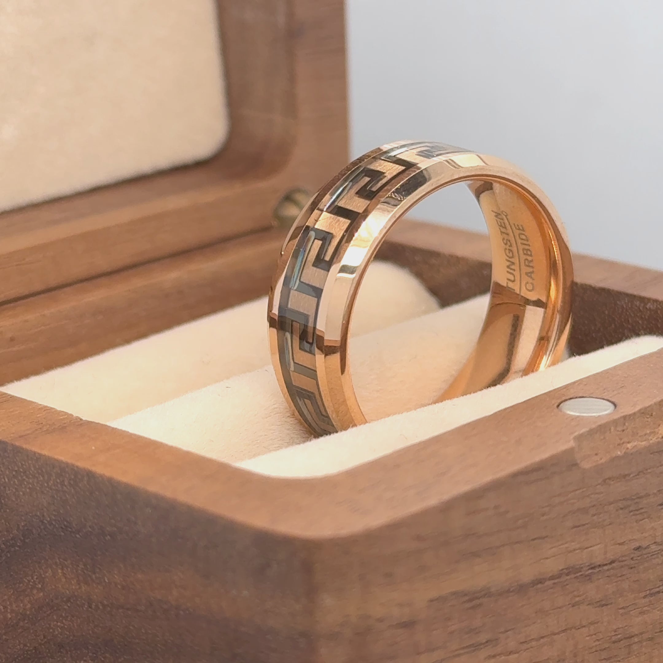 Rose Gold IP/Black IP High Polished Beveled Edge Greek Key Inlay Tungsten Ring