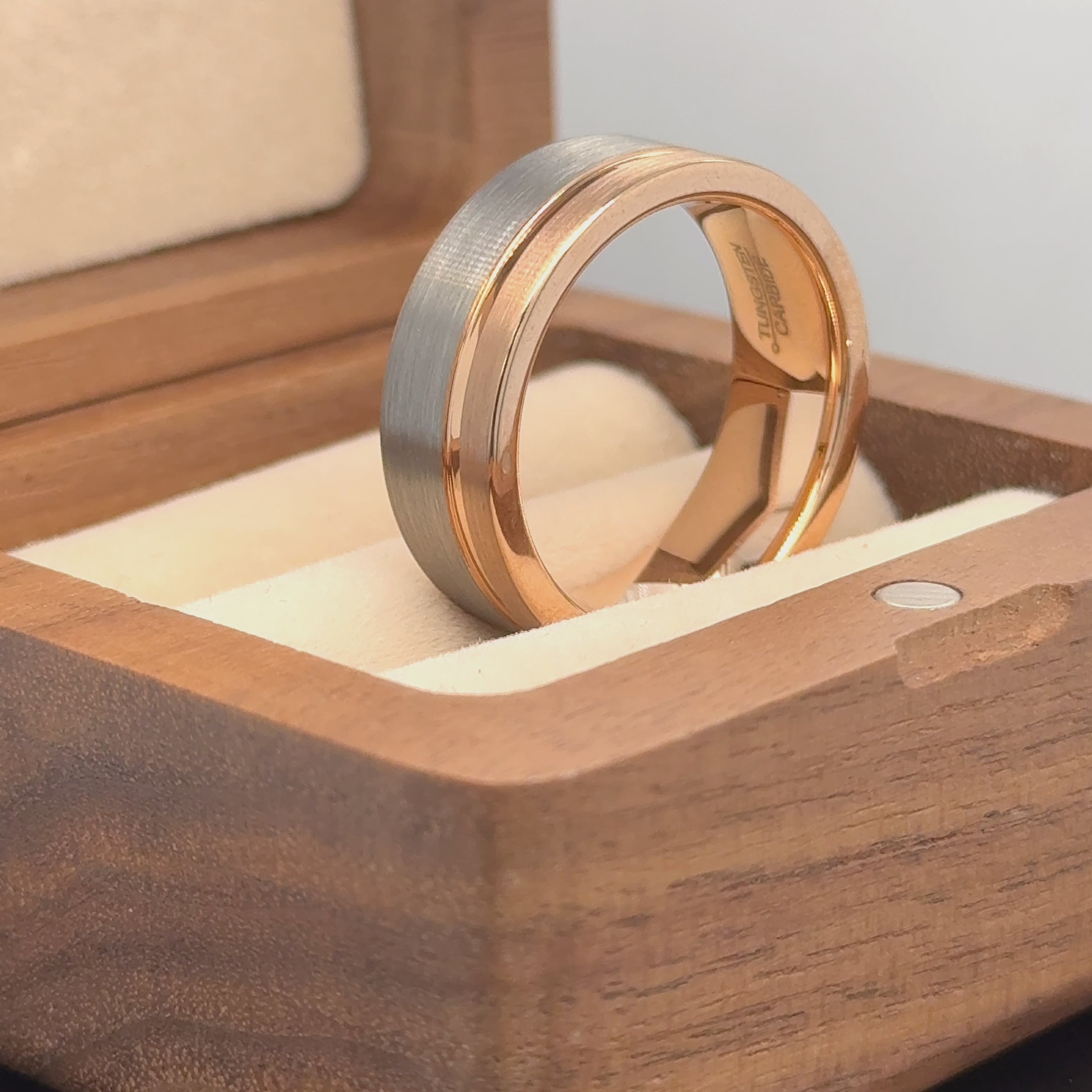 8mm Rose Gold IP Plated Inside & Groove Brushed Center Tungsten Ring