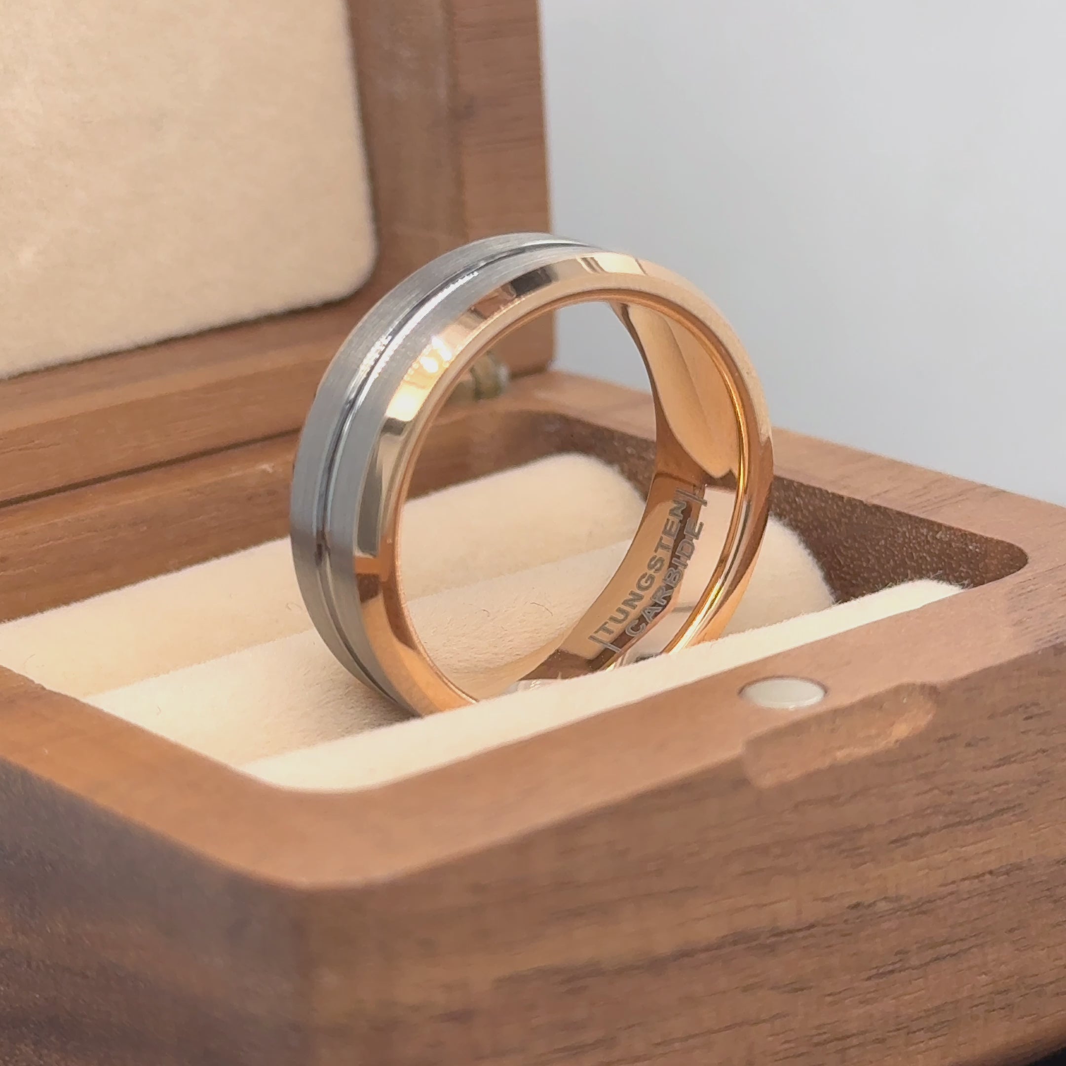 Experience the fusion of elegance and modernity with our Rose Gold IP Plated Inside & Gun Metal Grooved Brushed Center Tungsten Ring, a testament to craftsmanship and style. Crafted from premium tungsten carbide, this ring combines strength with a luxurious aesthetic. The interior boasts a rose gold ion plating, radiating warmth and sophistication, while the gun metal grooved center adds texture and visual interest. The brushed center finish enhances the ring's modern appeal, making it a versatile choice for any occasion. Whether chosen as a wedding band or a fashion statement, this ring exemplifies timeless elegance and contemporary design, making it an essential addition to your collection.