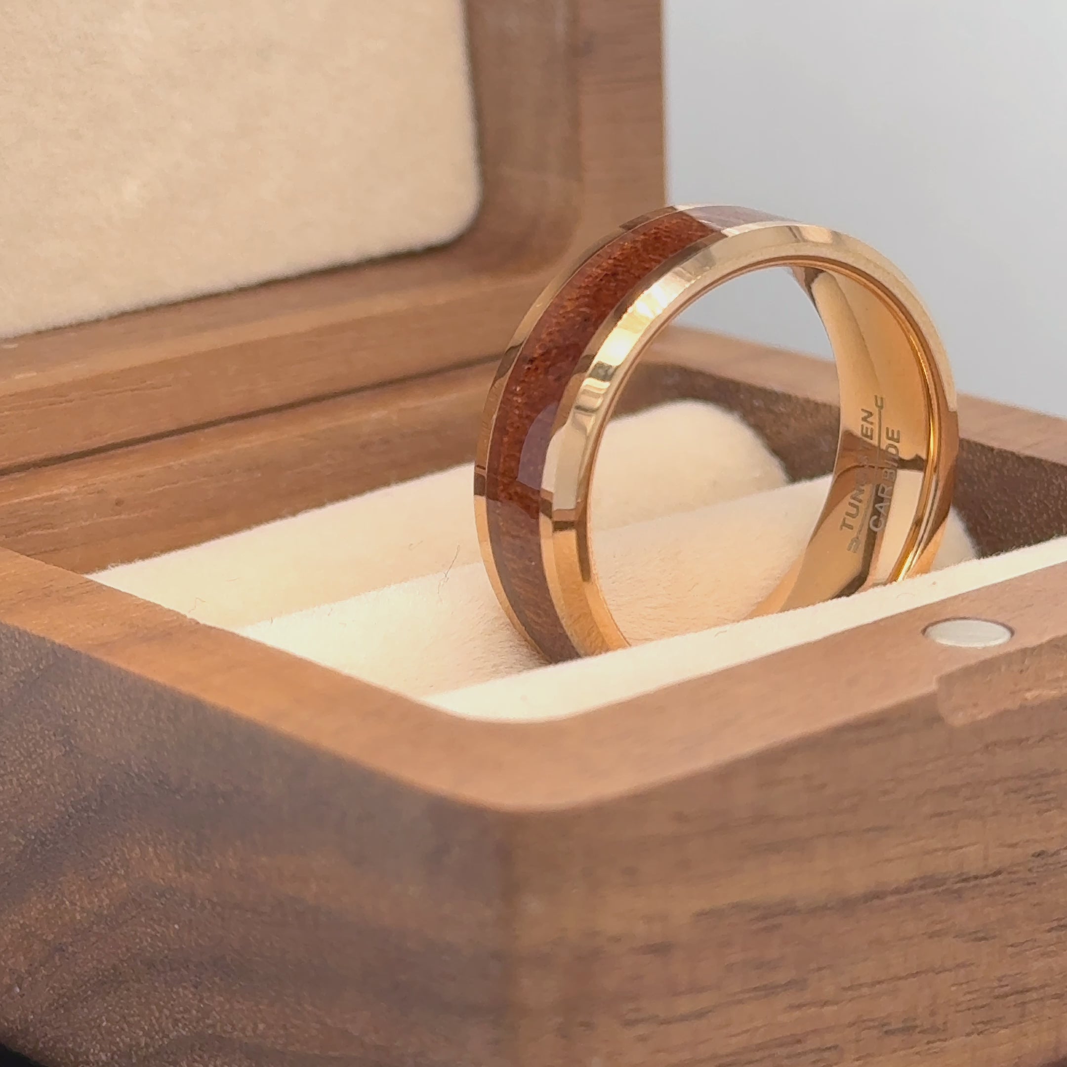 Rose Gold IP Plated with Hawaiian Koa Wood Inlay Shiny Beveled Edge Tungsten Ring