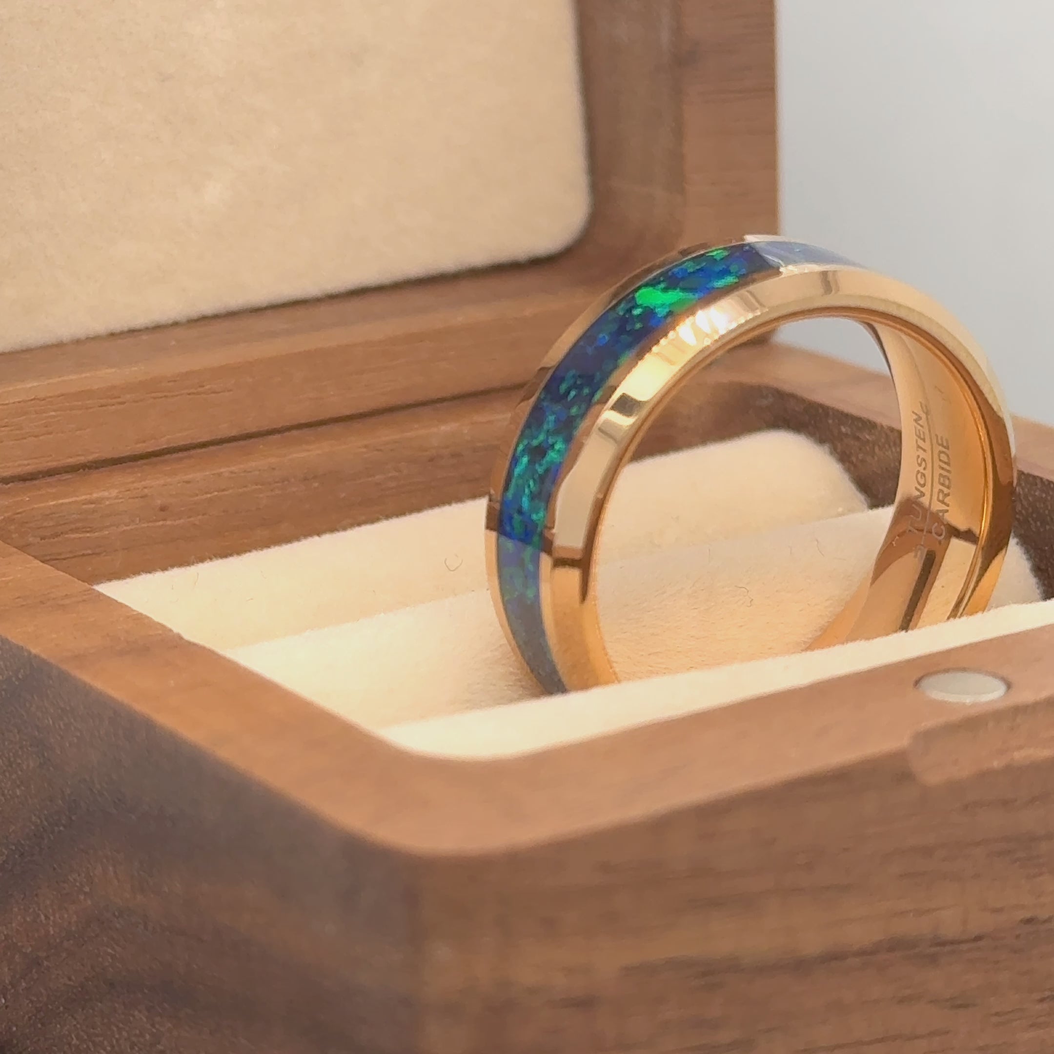 Elevate your style with our Rose Gold IP Plated Tungsten Ring featuring a mesmerizing Synthetic Emerald-Green Opal Inlay. This ring combines the durability of tungsten carbide with the elegance of rose gold IP plating, creating a striking piece that stands out. The synthetic emerald-green opal inlay catches light from every angle, showcasing its vibrant hues and adding a touch of sophistication to any occasion. Whether worn as a wedding band or as a fashion accessory, this ring promises to make a statement with its unique design and superior craftsmanship.
