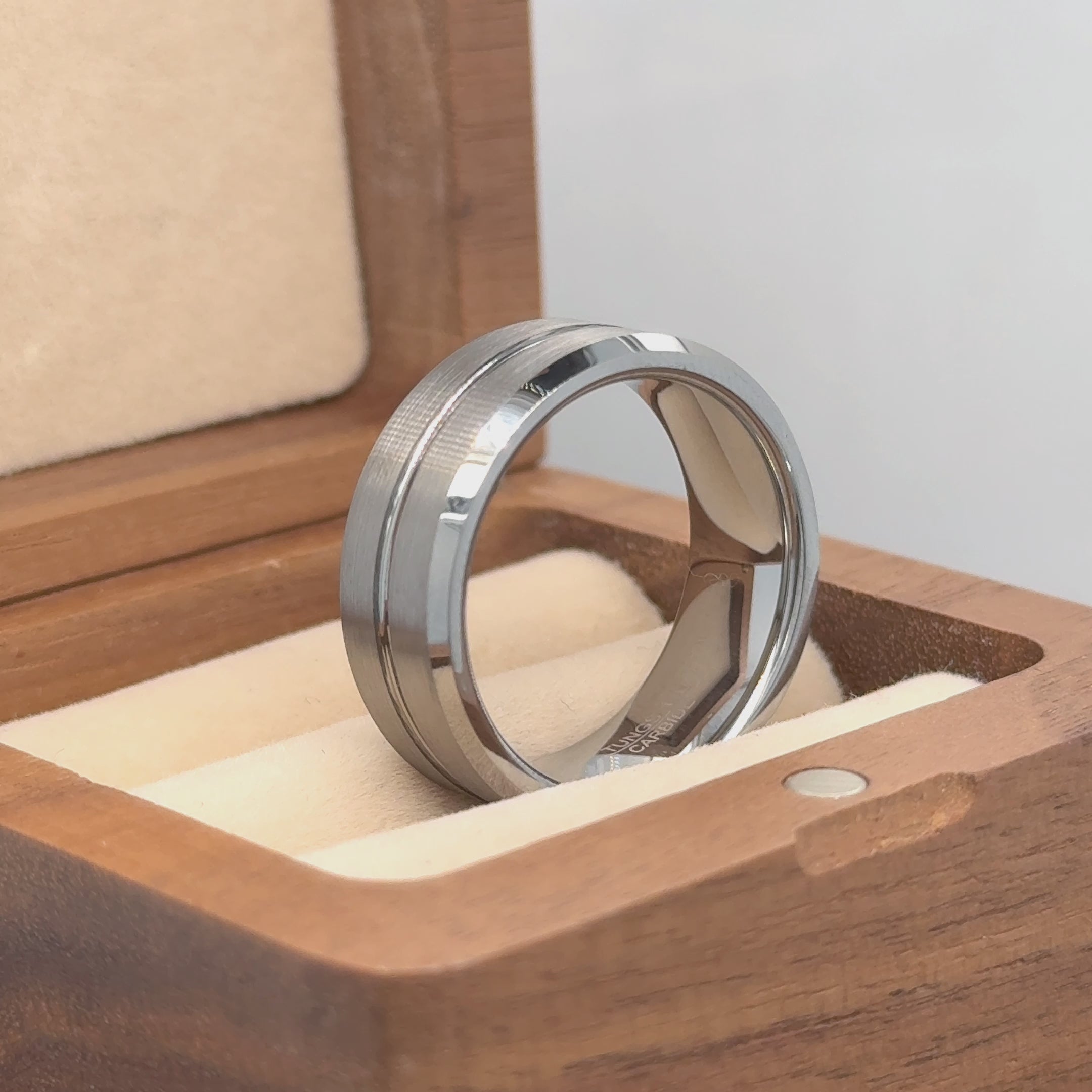Introducing our Shiny Grooved Center Brushed Sides Tungsten Ring, meticulously crafted from high-quality tungsten carbide known for its durability and resilience. The shiny grooved center adds a touch of sophistication, while the brushed sides provide a contemporary and textured appearance. This ring is designed for the modern gentleman who values both style and functionality in their accessories. Whether worn as a symbol of commitment or as a statement piece, our Shiny Grooved Center Brushed Sides Tungsten Ring exemplifies timeless elegance and enduring craftsmanship