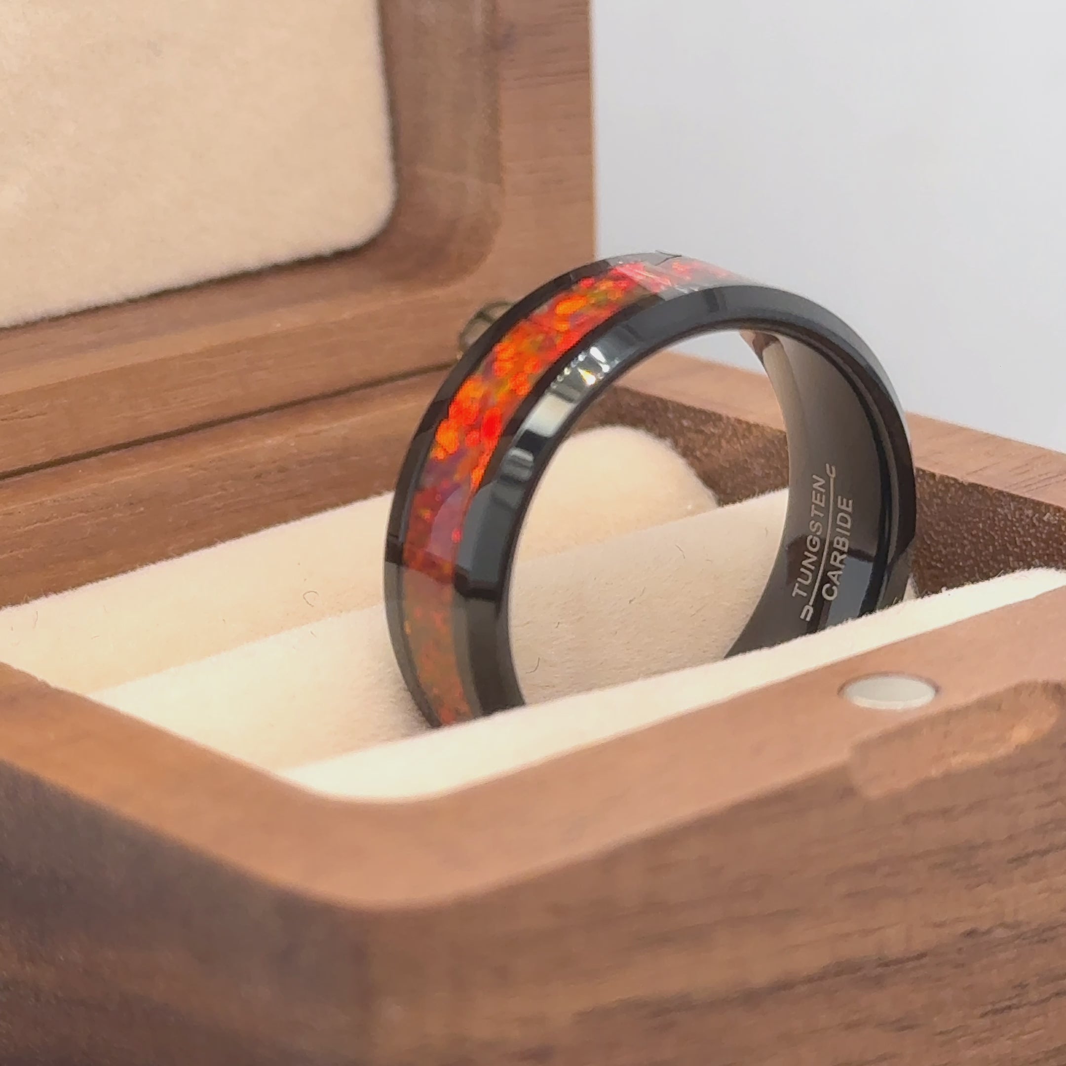 8mm Silver / Black IP Plated Synthetic Red Fire Opal Inlay Beveled Edge Tungsten Ring