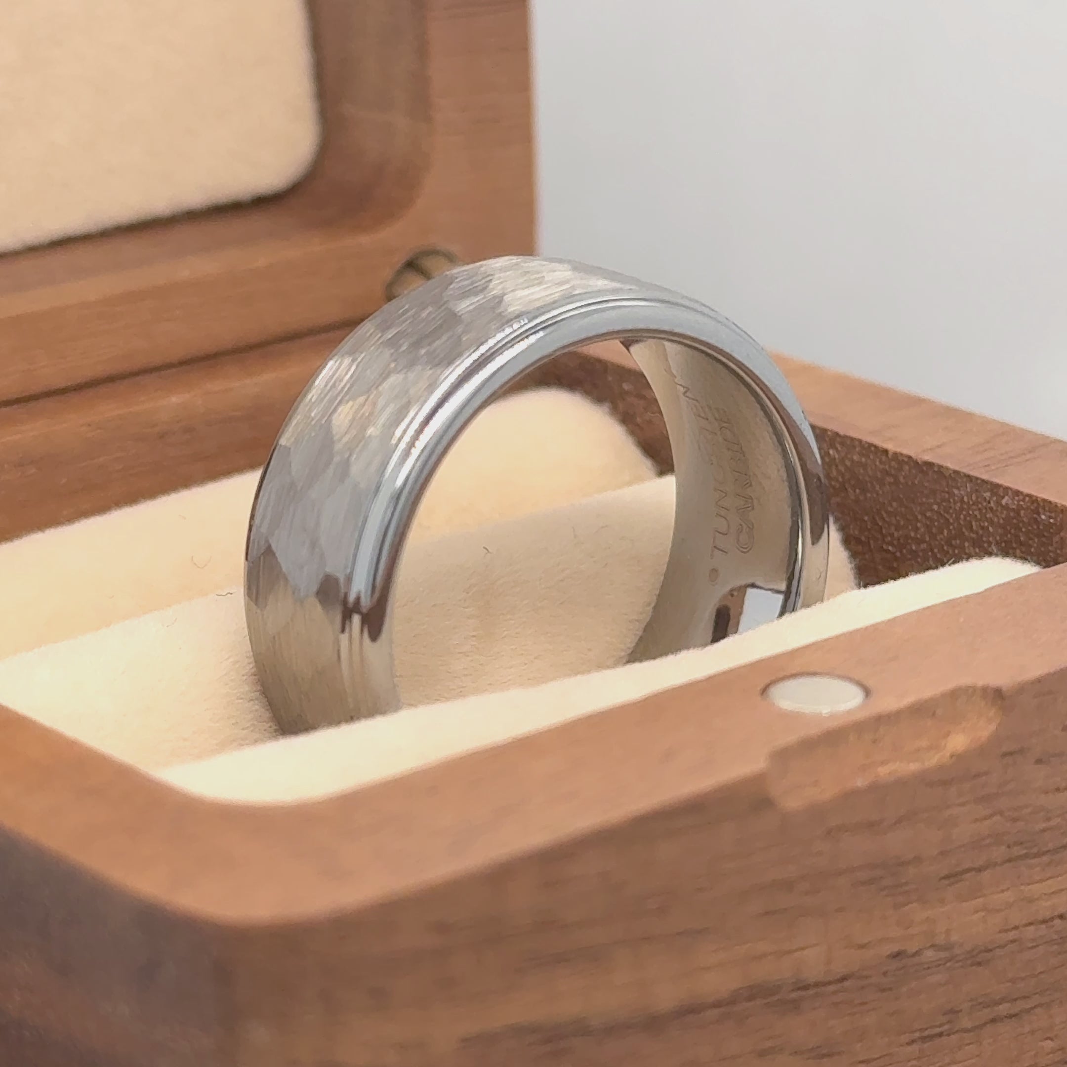 Discover uniqueness with our Stepped Down Edge Hammered Center Tungsten Ring. Crafted from tungsten carbide, known for its strength and scratch resistance, this ring showcases a hammered center that adds texture and character. The stepped down edges provide a modern twist, making it a versatile choice for any occasion. Whether chosen as a symbol of commitment or as a fashion statement, this ring combines durability with distinctive aesthetics. Our Stepped Down Edge Hammered Center Tungsten Ring is designed to withstand daily wear while maintaining its unique appeal.