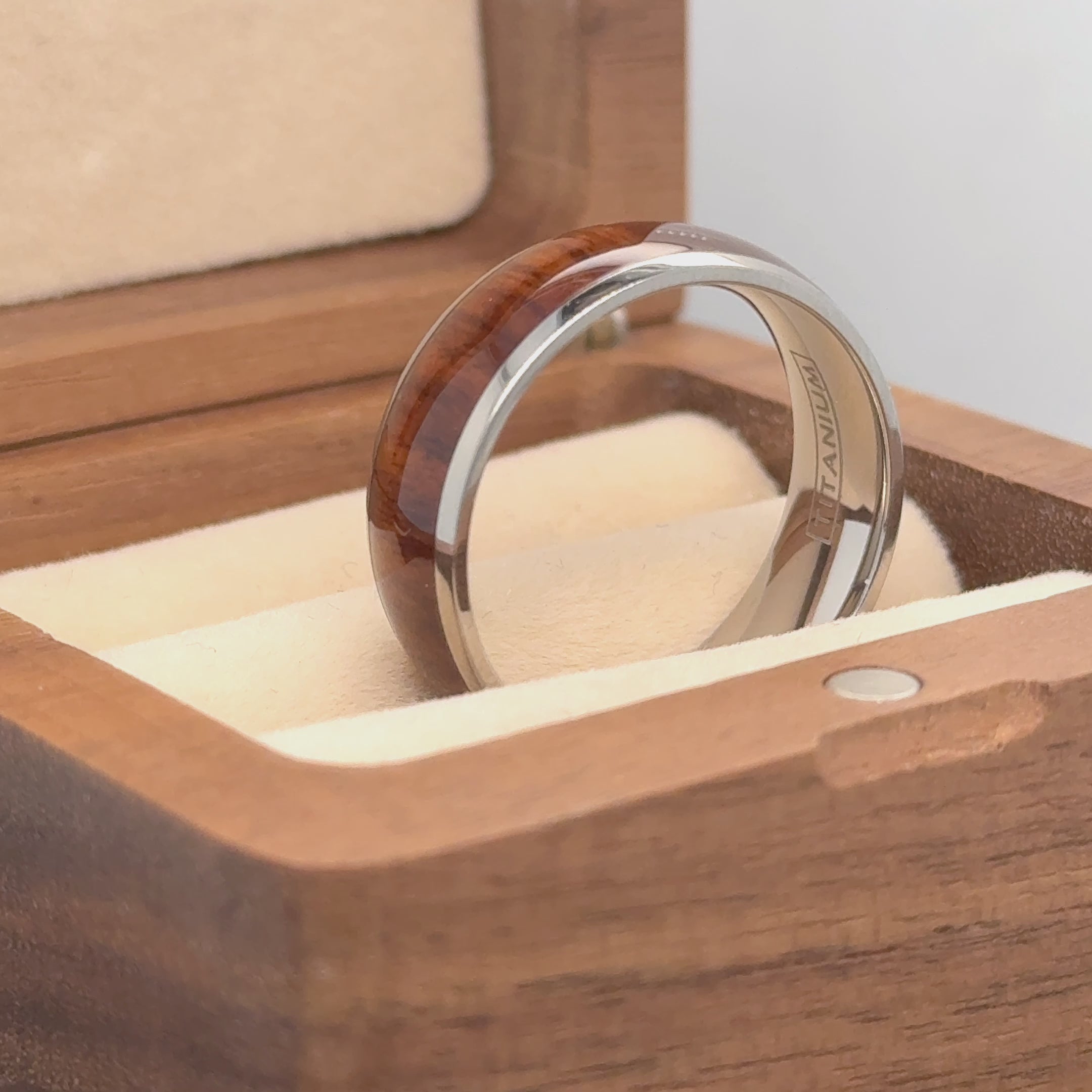 Discover timeless elegance with our Titanium Ring High Polished Domed with Rosewood Inlay, a blend of modern sophistication and natural beauty. Crafted from titanium, prized for its lightweight feel and strength, this ring offers both durability and comfort. The high polished finish creates a smooth and shiny surface that catches the light beautifully. The domed design ensures a comfortable fit, making it suitable for everyday wear. The rosewood inlay adds a touch of warmth and richness, contrasting beautifully with the titanium. Whether as a wedding band or a stylish accessory, this ring is a symbol of enduring love and refined taste.