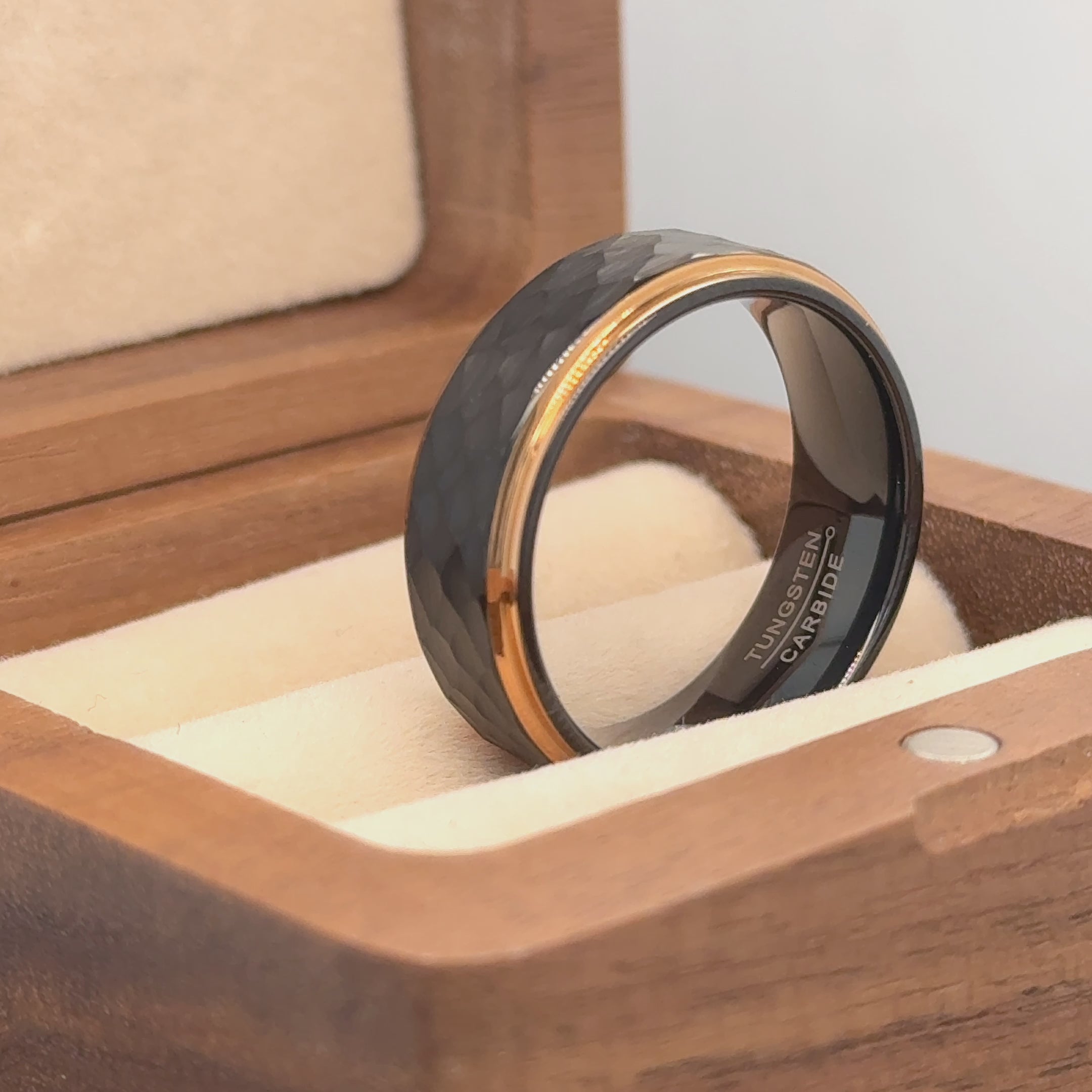 Two-Tone Black & Rose Gold IP Plated Hammered Center Tungsten Ring