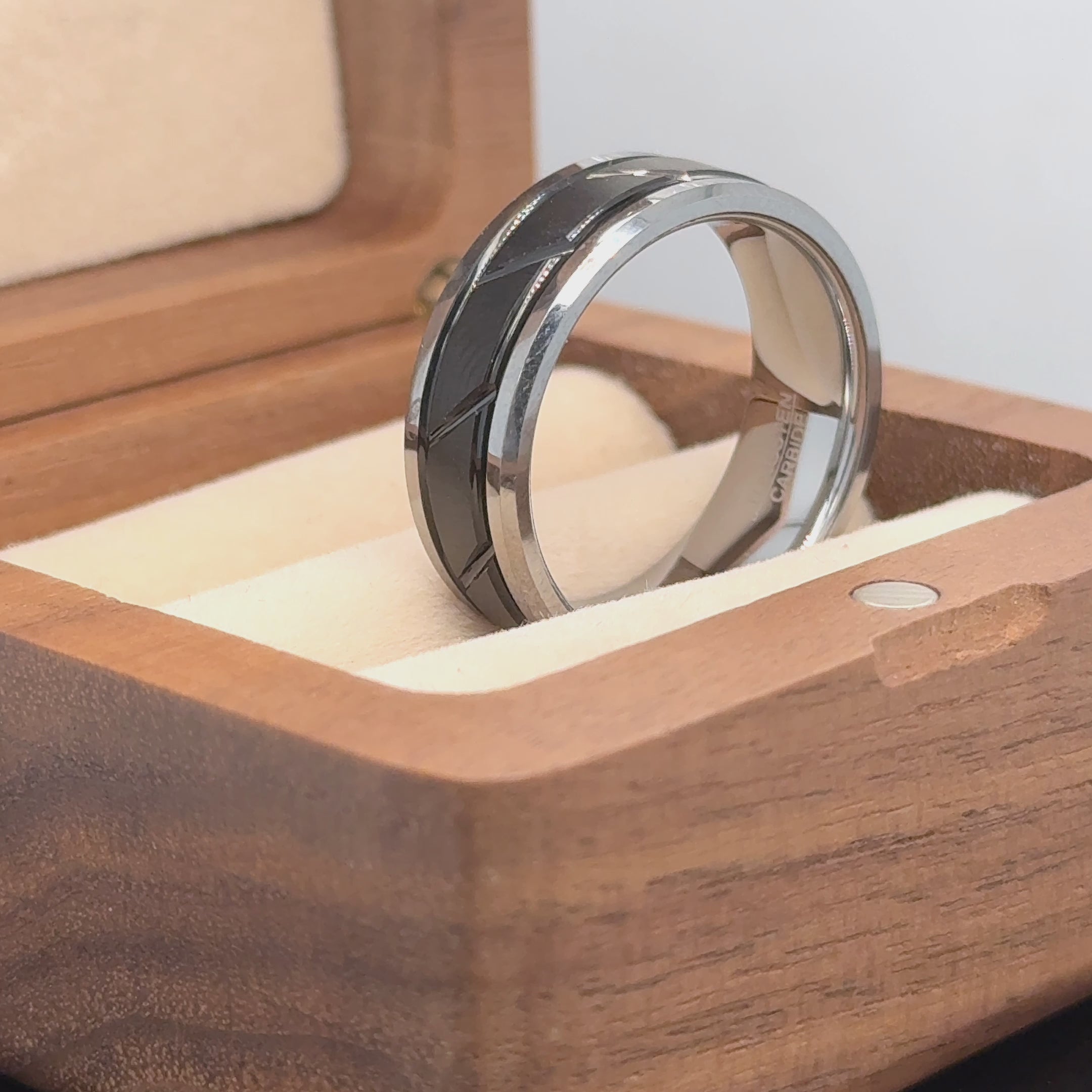 8mm Two-Tone Tungsten Ring with Black IP Center and Diagonal Grooves