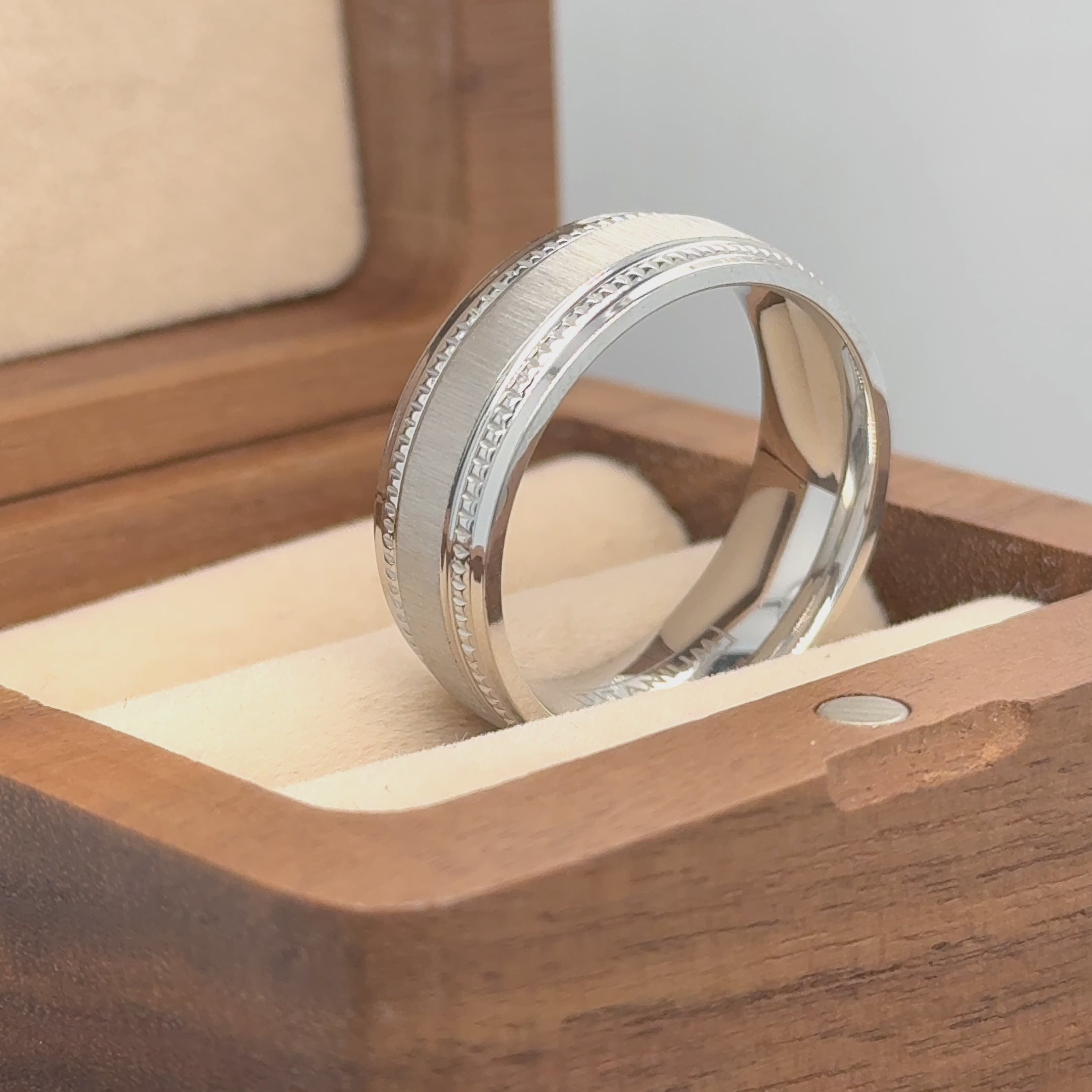 Experience sophistication and craftsmanship with our White IP Plated Titanium Ring, showcasing a Satin Finish Center with Milgrain Stepped Edge. This ring combines a sleek satin finish center with intricate milgrain detailing along the stepped edge, creating a timeless and refined aesthetic. The white IP plating adds a modern touch while enhancing the ring's durability and scratch-resistance. Crafted from titanium, prized for its lightweight feel and resistance to corrosion, this ring is not just a symbol of style but also a testament to strength and endurance. Whether chosen as a wedding band or as a distinguished accessory, this ring promises to elevate any occasion with its understated elegance and impeccable design.
