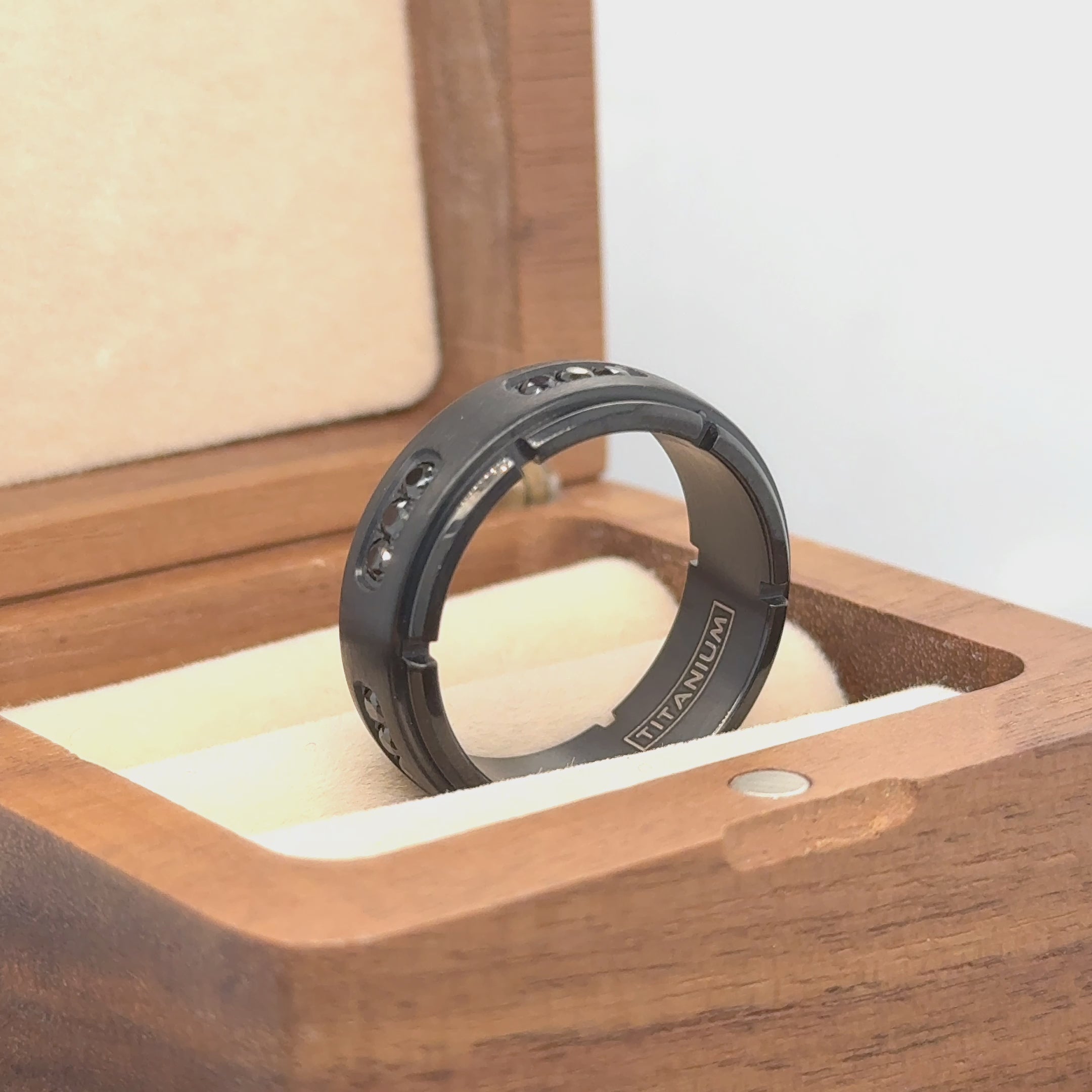✅ Striking black IP plated titanium ring adorned with 18 black CZs