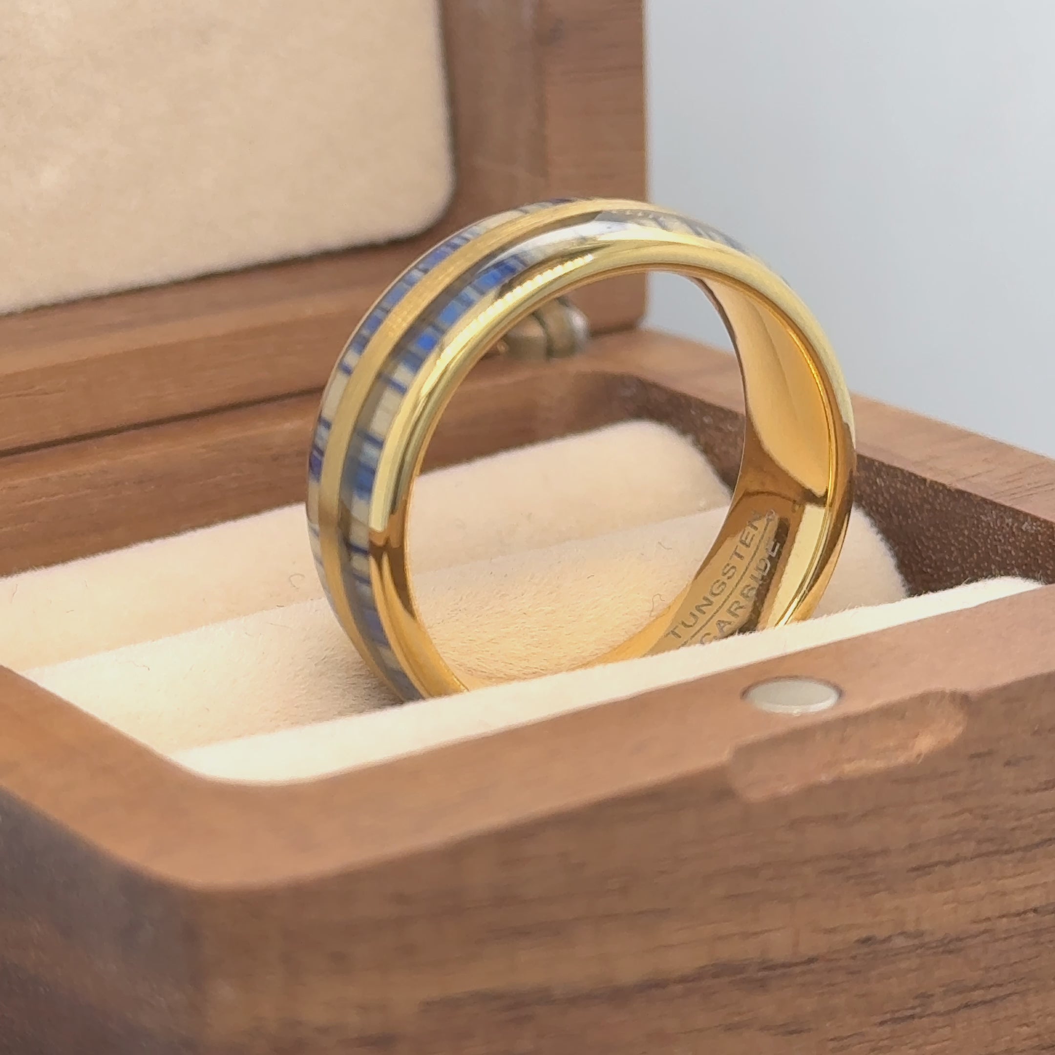 8mm Yellow Gold IP & Indigo Blue Dyed Bamboo Inlay / Jade Wood Inlay Tungsten Ring
