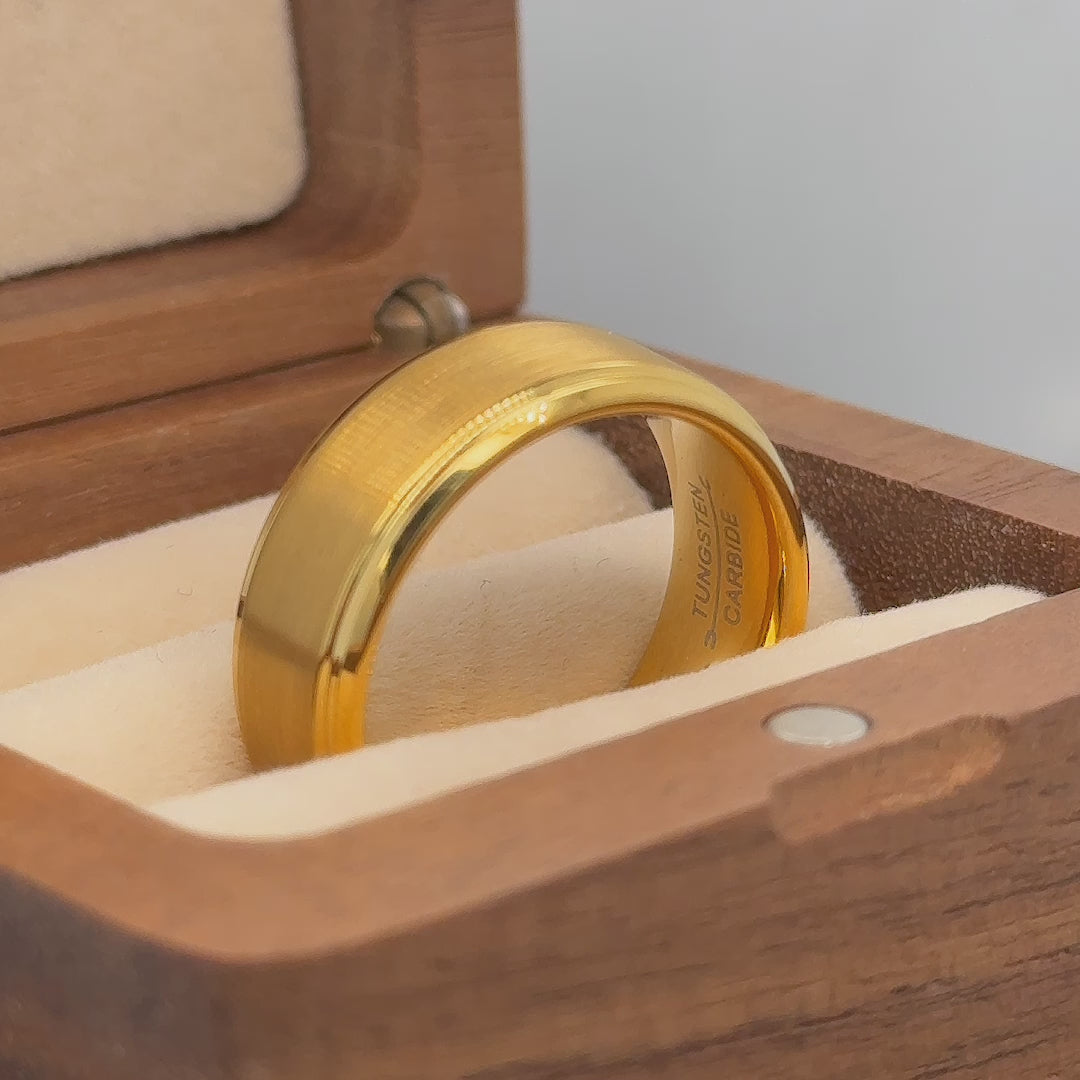 Elevate your style with our Yellow Gold IP Plated Flat Brushed Center with High Polish Stepped Edge Tungsten Ring, a blend of sophistication and modern design. The flat brushed center of the ring offers a subdued yet distinctive texture, while the high polish stepped edge adds a touch of elegance and contrast. Crafted from tungsten carbide, known for its durability and scratch-resistance, this ring is built to withstand the rigors of daily wear. Whether worn as a symbol of commitment or as a fashion statement, this ring promises enduring style and versatility.