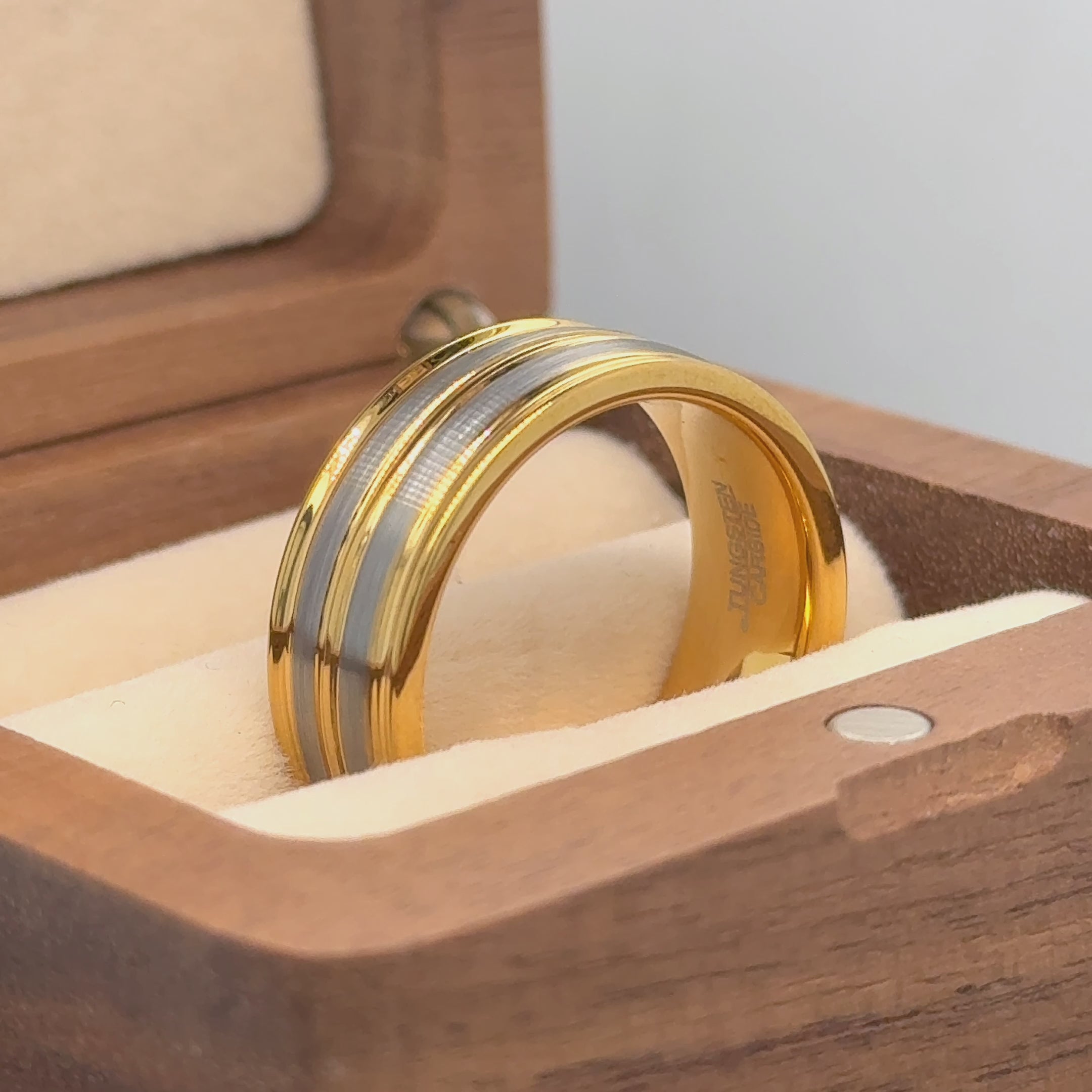 Embrace refinement with our Yellow Gold IP Plated Pinstripe & Gun Metal Finish Low Beveled Edge Tungsten Ring, a testament to modern craftsmanship. Made from tungsten, renowned for its strength and scratch-resistance, this ring showcases a striking contrast between a yellow gold IP plated pinstripe and a gun metal finish. The low beveled edges add a subtle touch of sophistication, making it suitable for any occasion. Whether chosen to symbolize commitment or as a statement piece, this ring blends durability with contemporary design, perfect for the discerning gentleman.