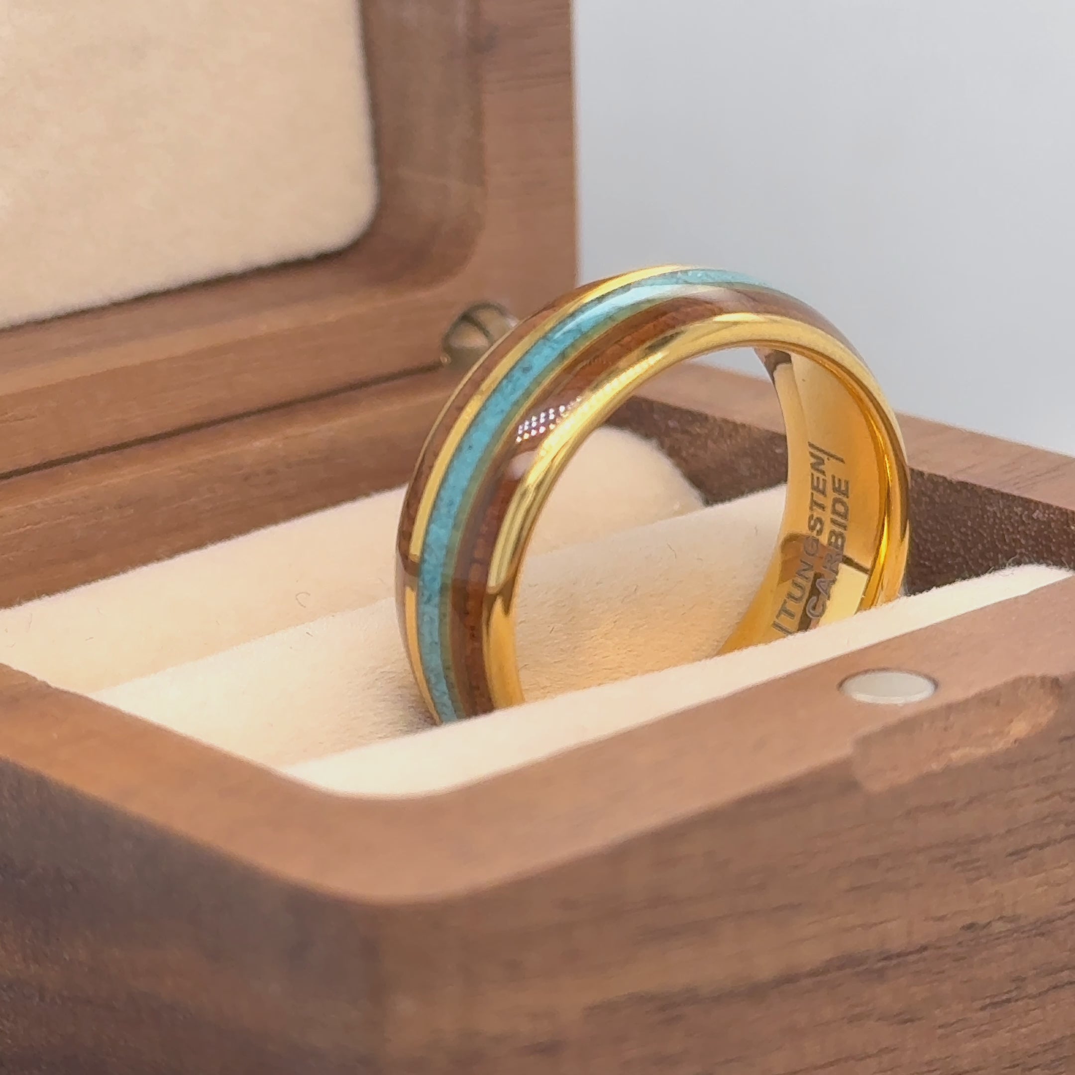 Yellow Gold IP Plated Tungsten Ring with Rosewood & Crushed Turquoise Inlay