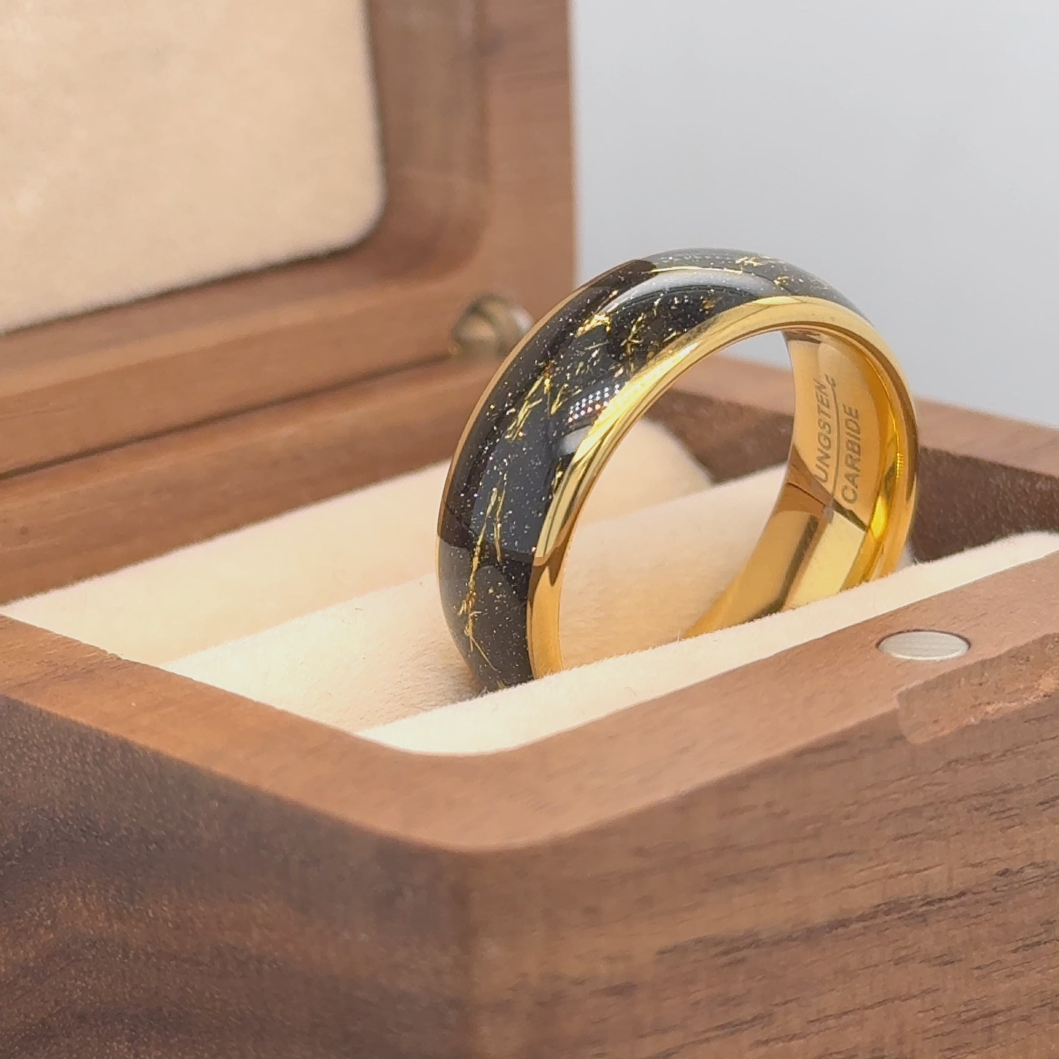 Elevate your style with our Yellow Gold IP Plated Tungsten Ring featuring an eye-catching imitation meteorite inlay. Crafted from durable tungsten carbide and finished with luxurious yellow gold IP plating, this ring blends modern elegance with rugged durability.