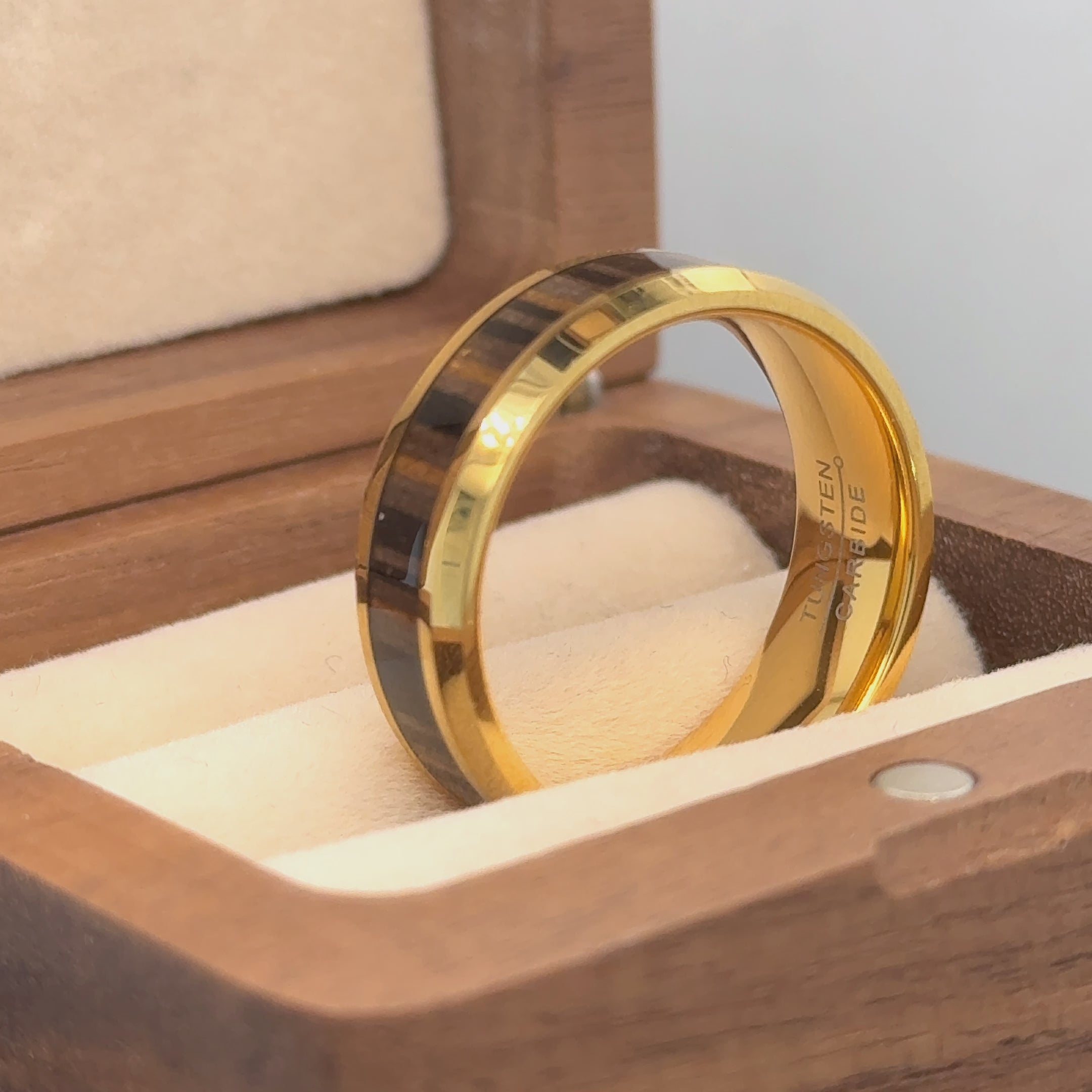 8mm Yellow Gold IP with Synthetic Black Turquoise Inlay/Zebra Wood Inlay Beveled Edge Tungsten Ring