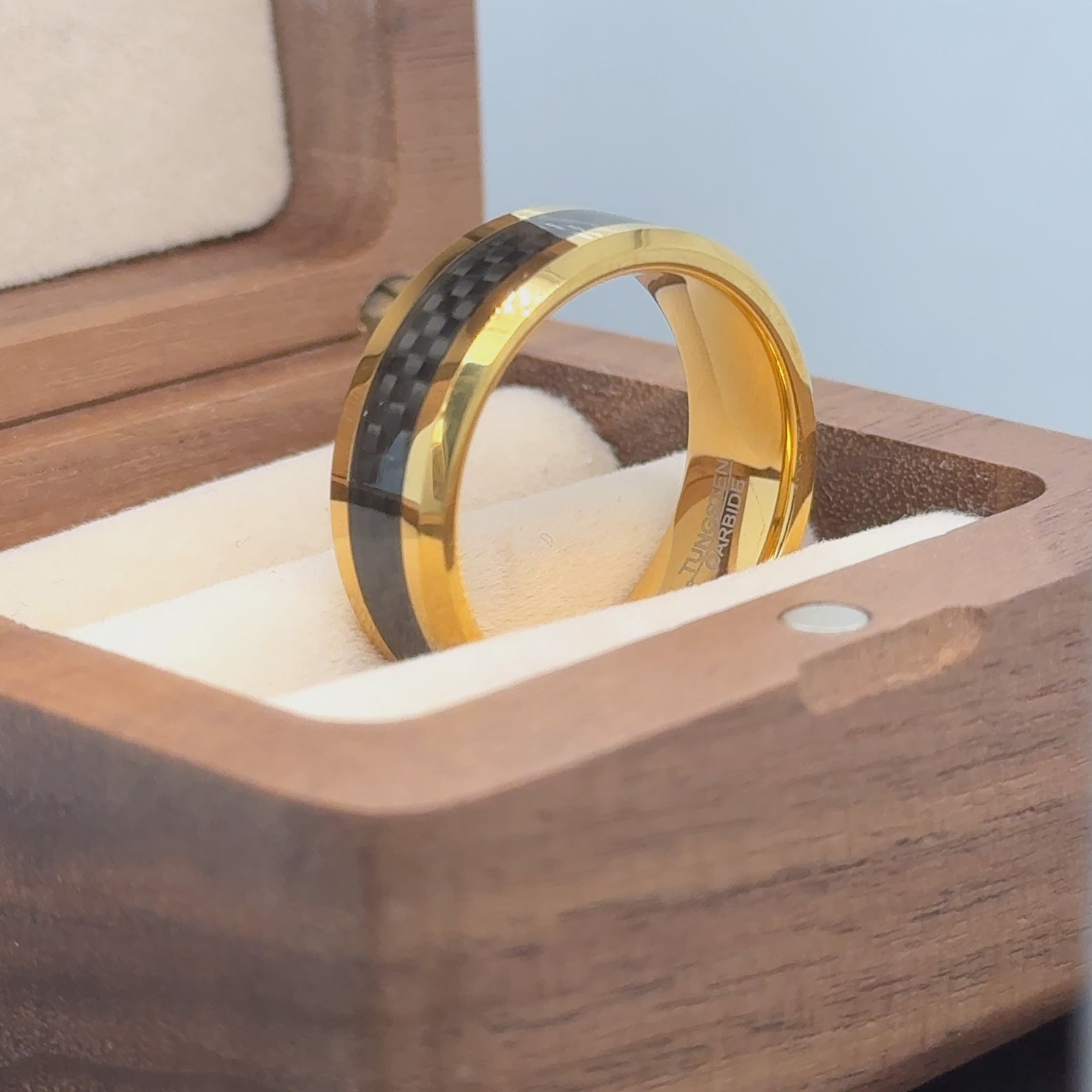 Yellow Gold/Silver Plated High Polish with Black Carbon Fiber Inlay Beveled Edge Tungsten Ring