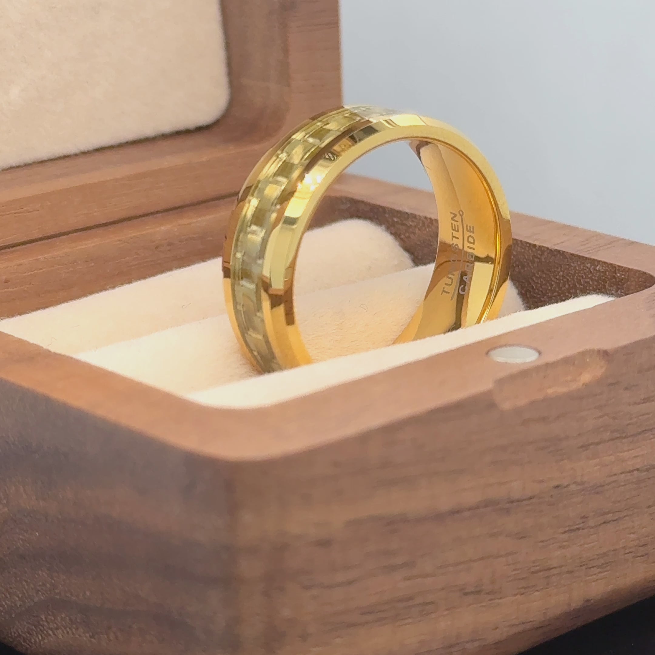 ✅ Crafted from durable tungsten carbide with yellow gold/silver plating.